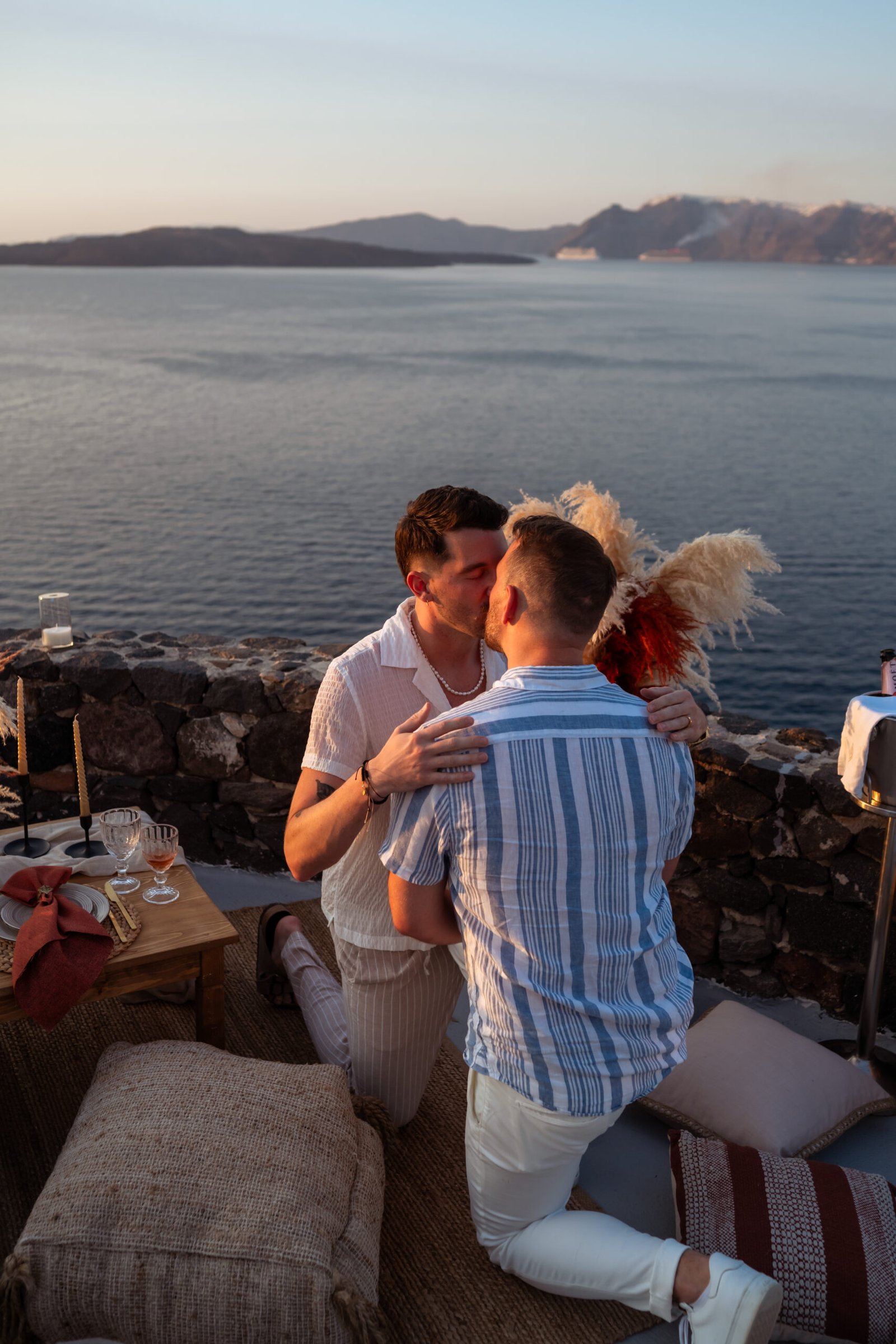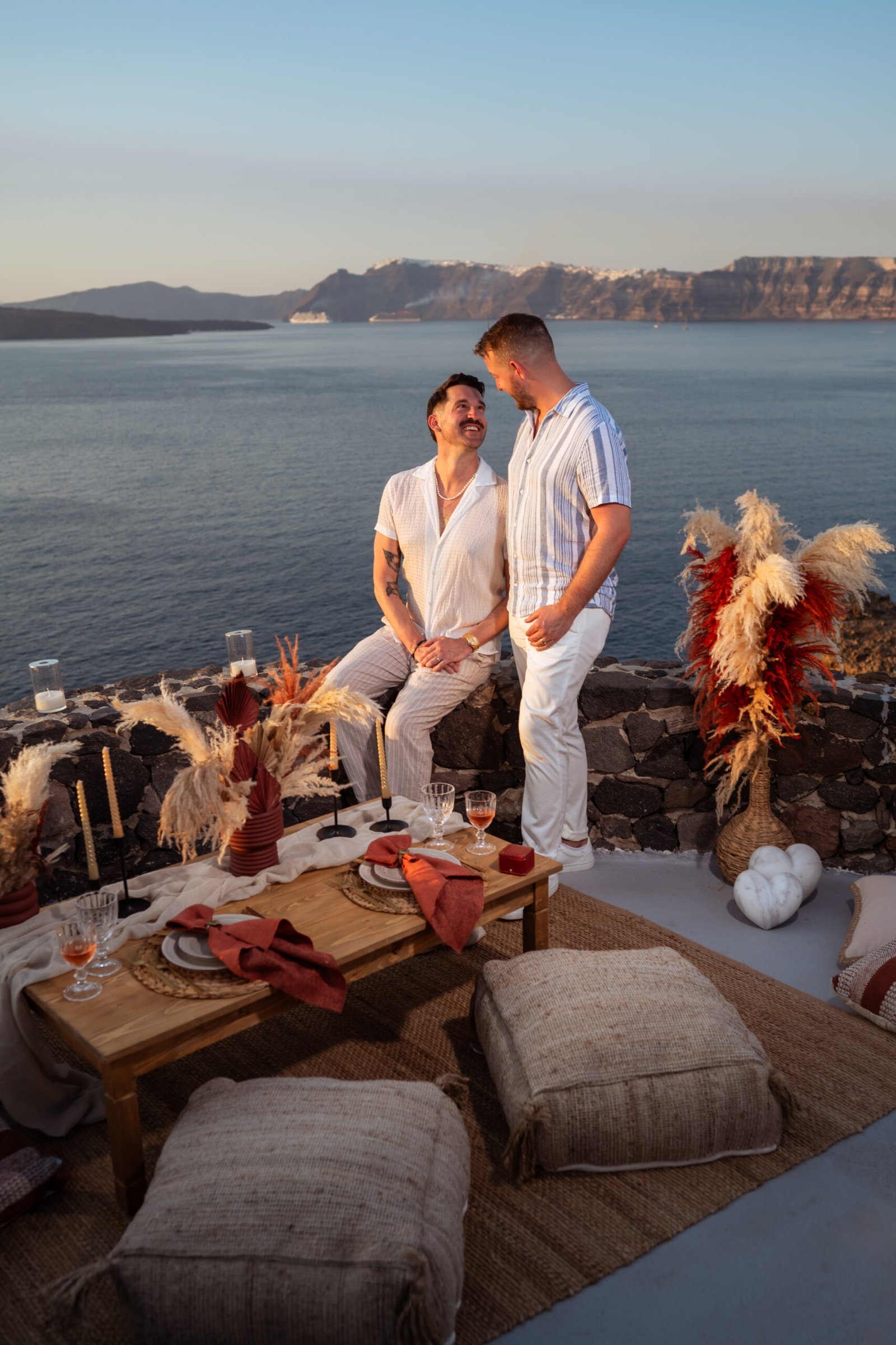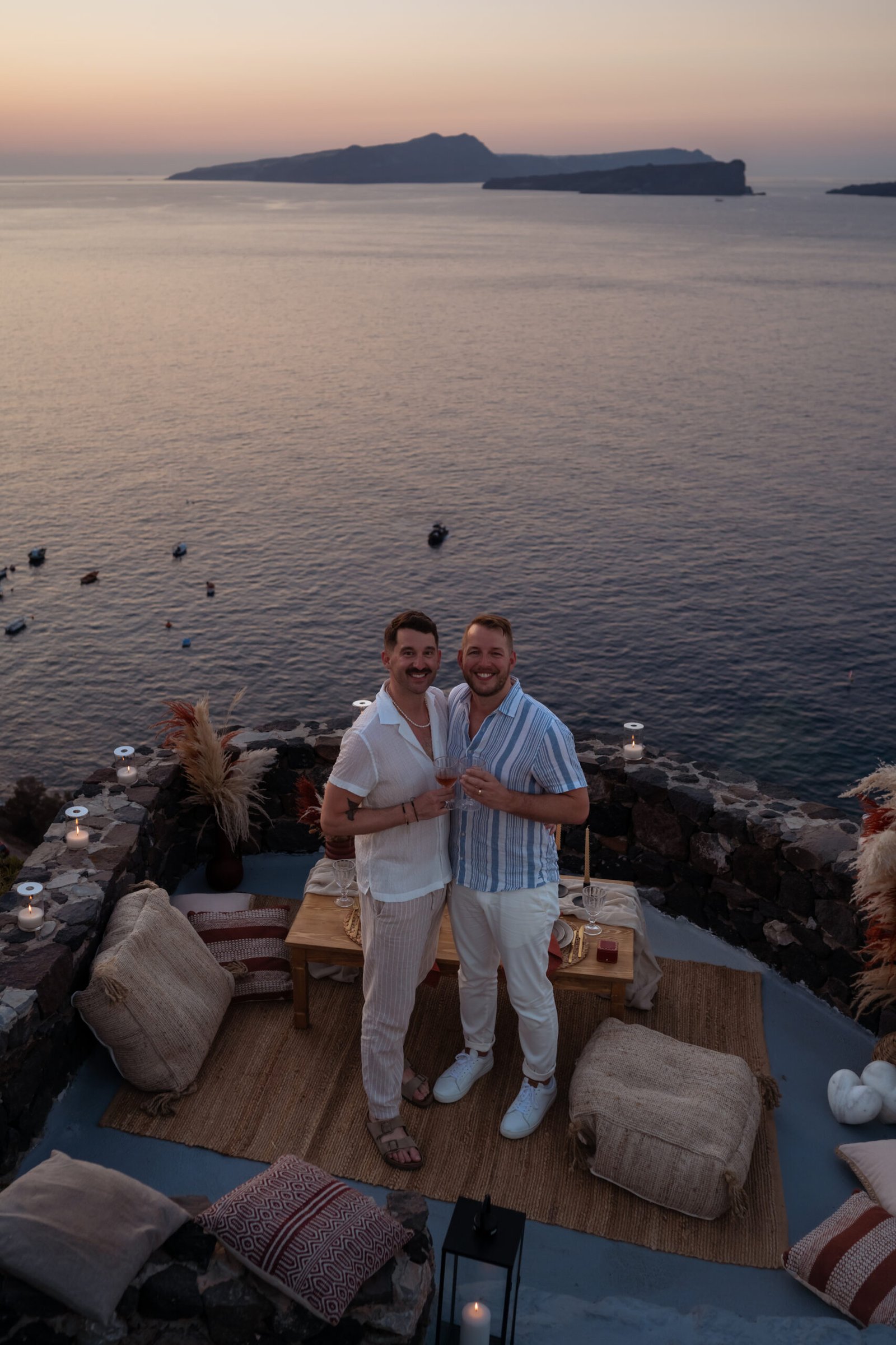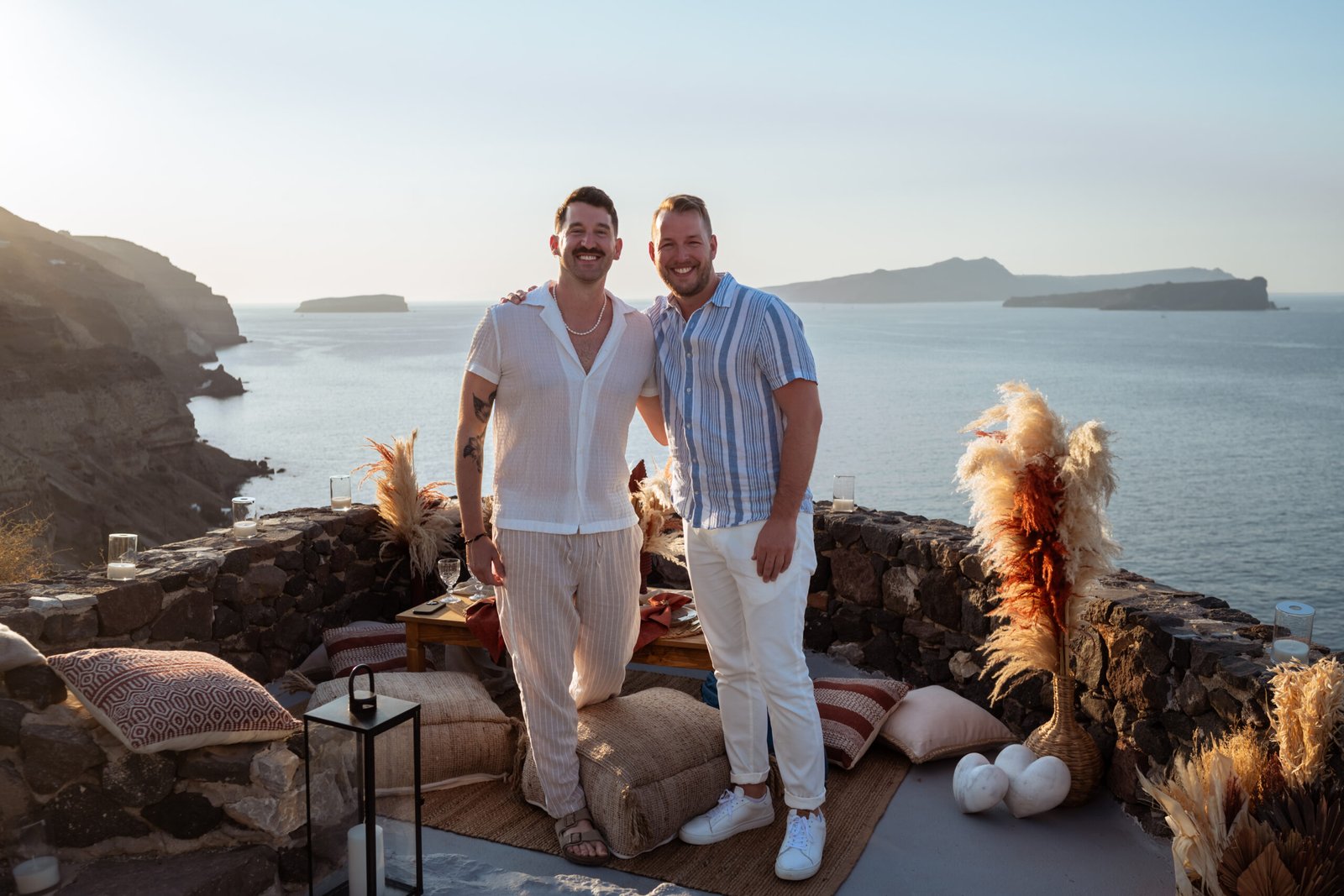 James guided Matt to the beautifully styled picnic setup, where the breathtaking Santorini sunset framed the scene. Surrounded by the endless sea and the iconic volcano view, James got down on one knee and asked the most important question of his life.
