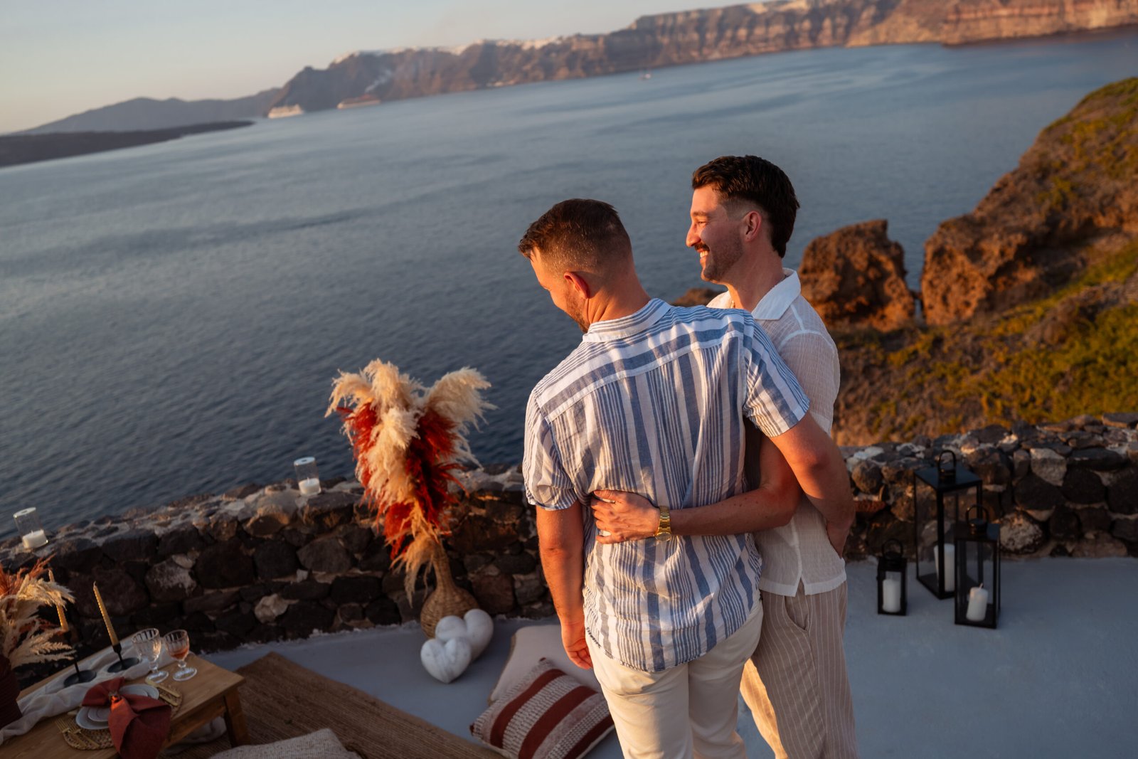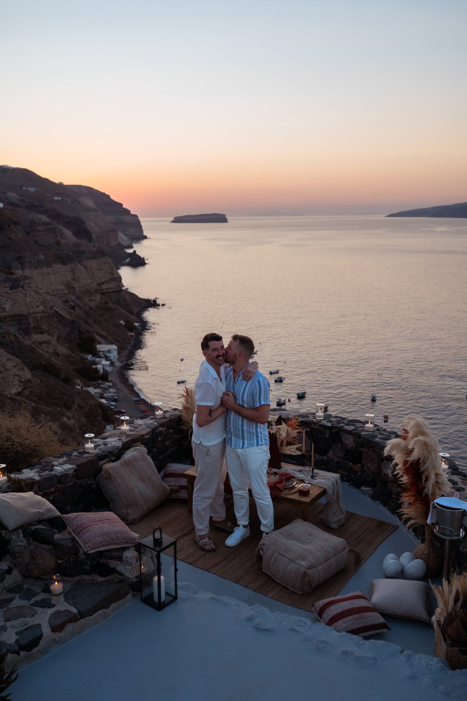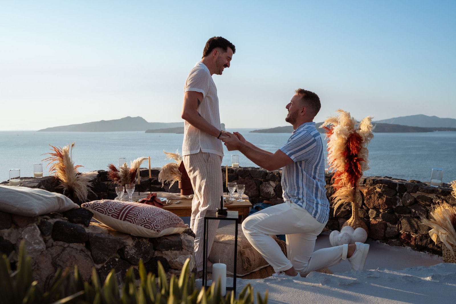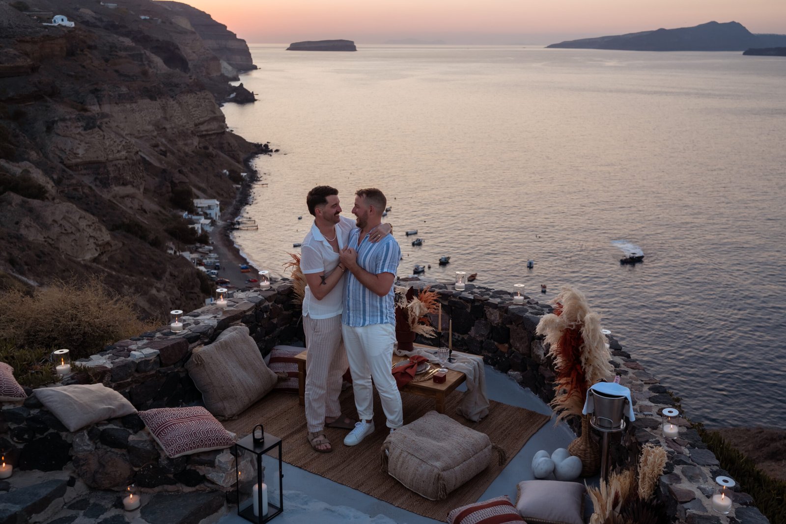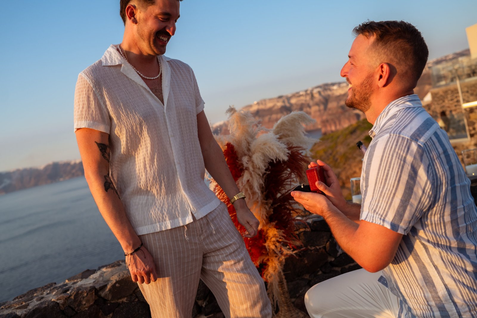 James guided Matt to the beautifully styled picnic setup, where the breathtaking Santorini sunset framed the scene. Surrounded by the endless sea and the iconic volcano view, James got down on one knee and asked the most important question of his life.