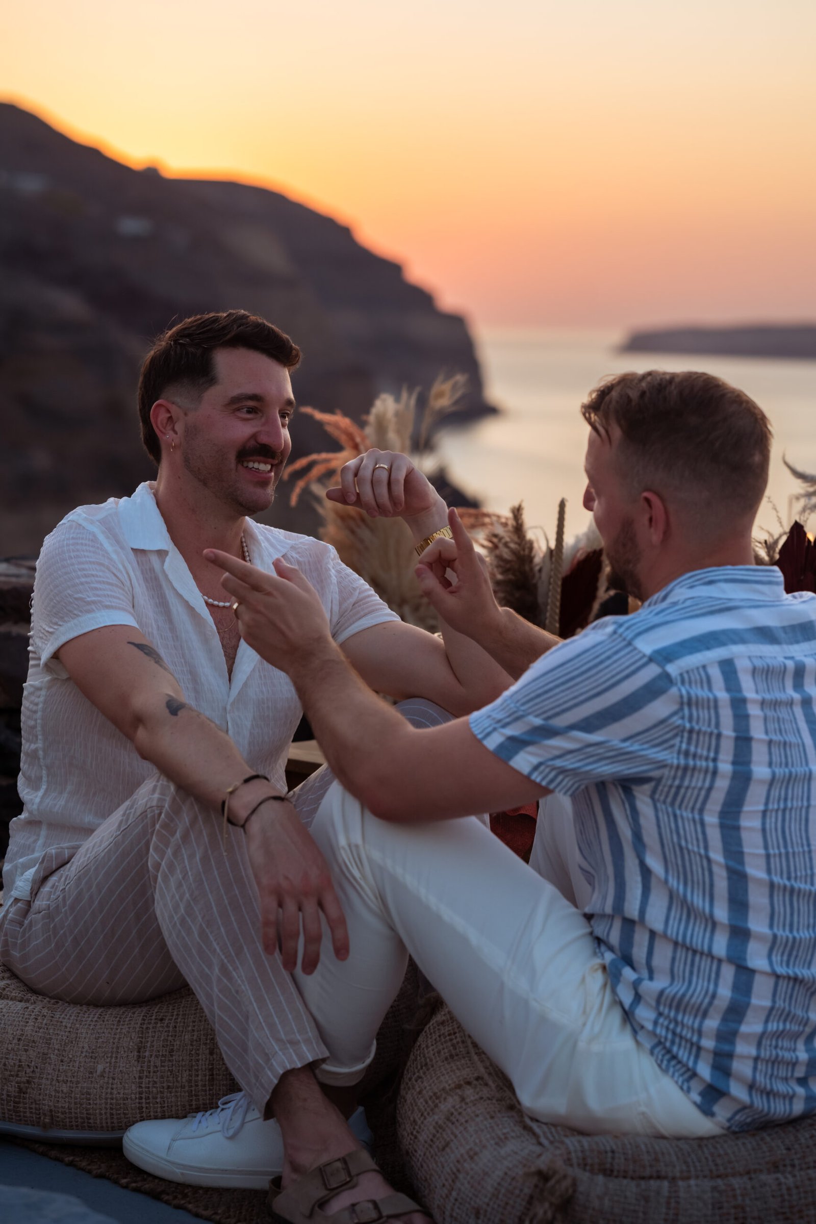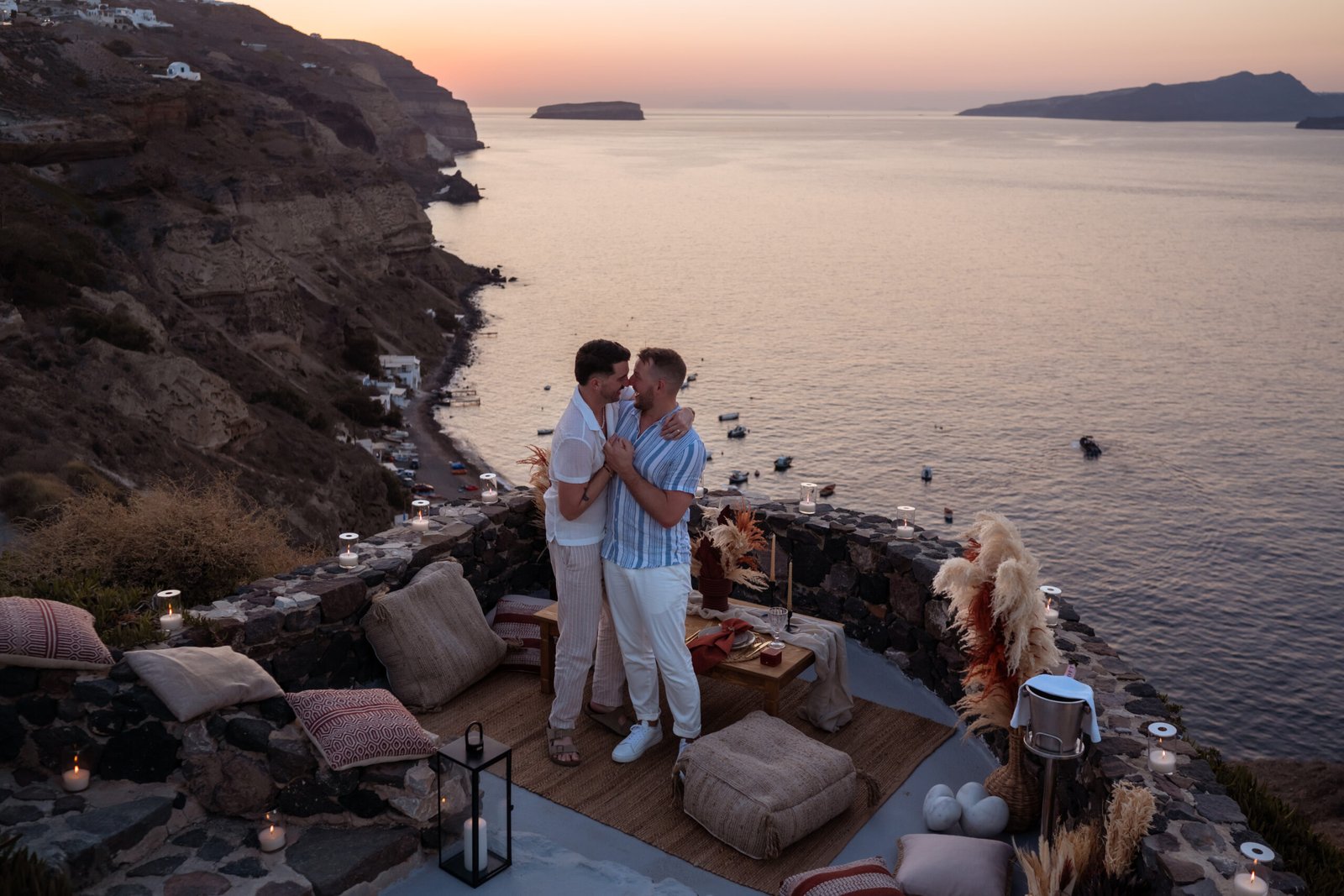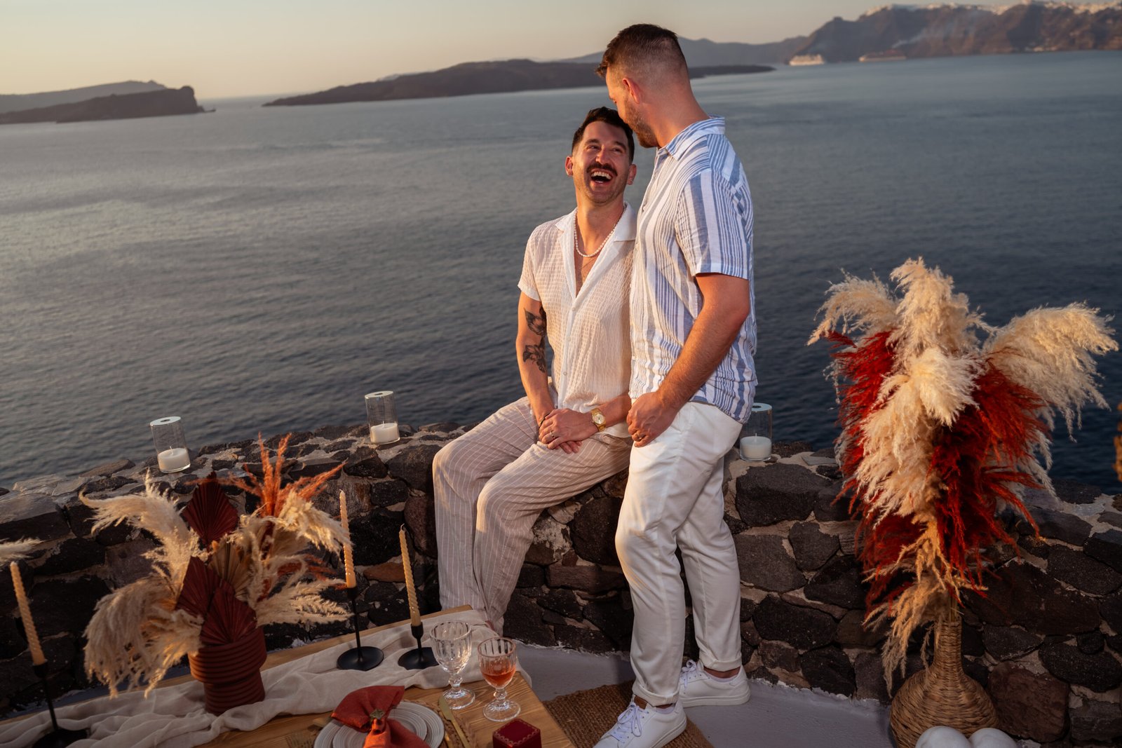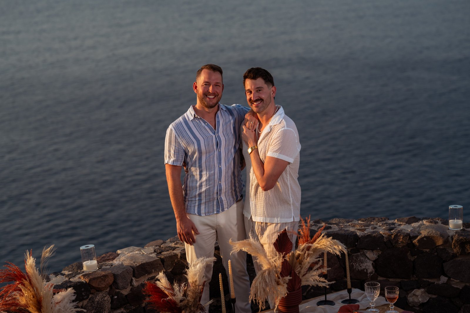 James guided Matt to the beautifully styled picnic setup, where the breathtaking Santorini sunset framed the scene. Surrounded by the endless sea and the iconic volcano view, James got down on one knee and asked the most important question of his life.