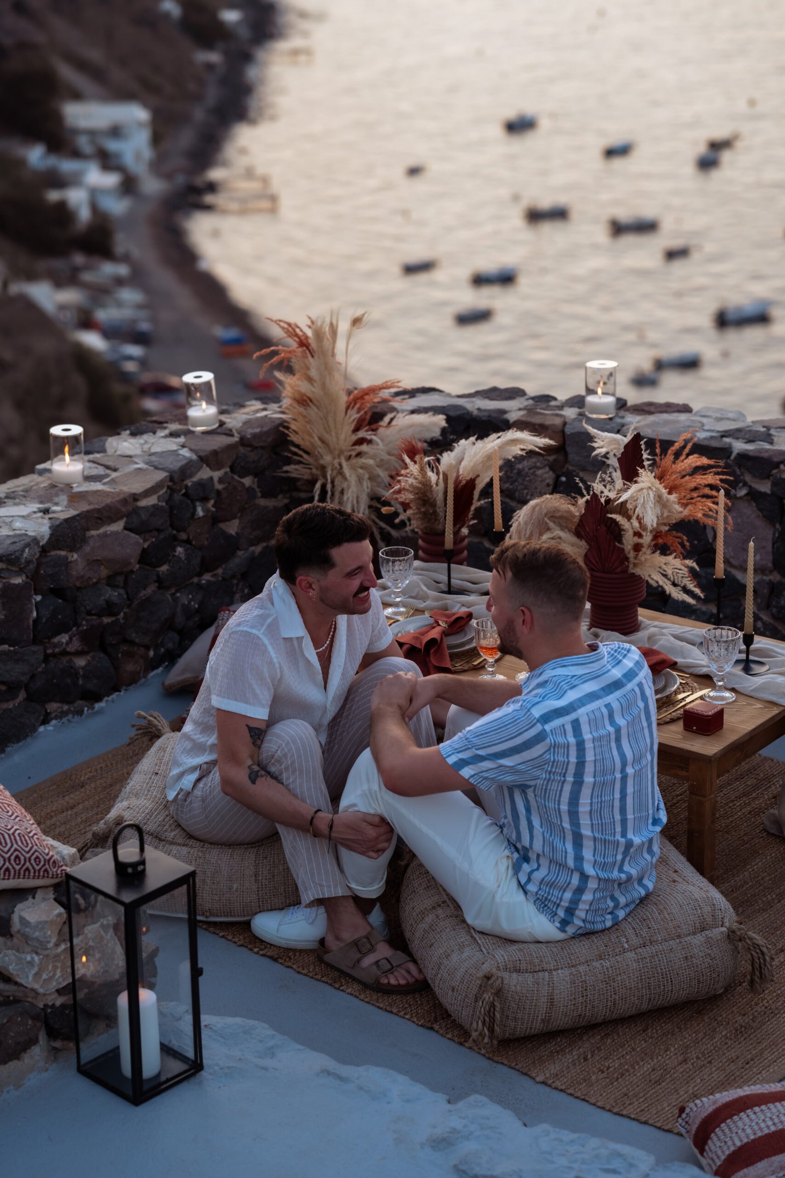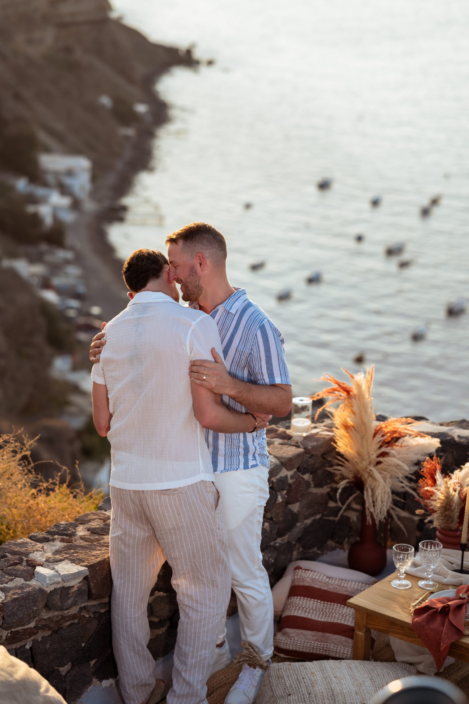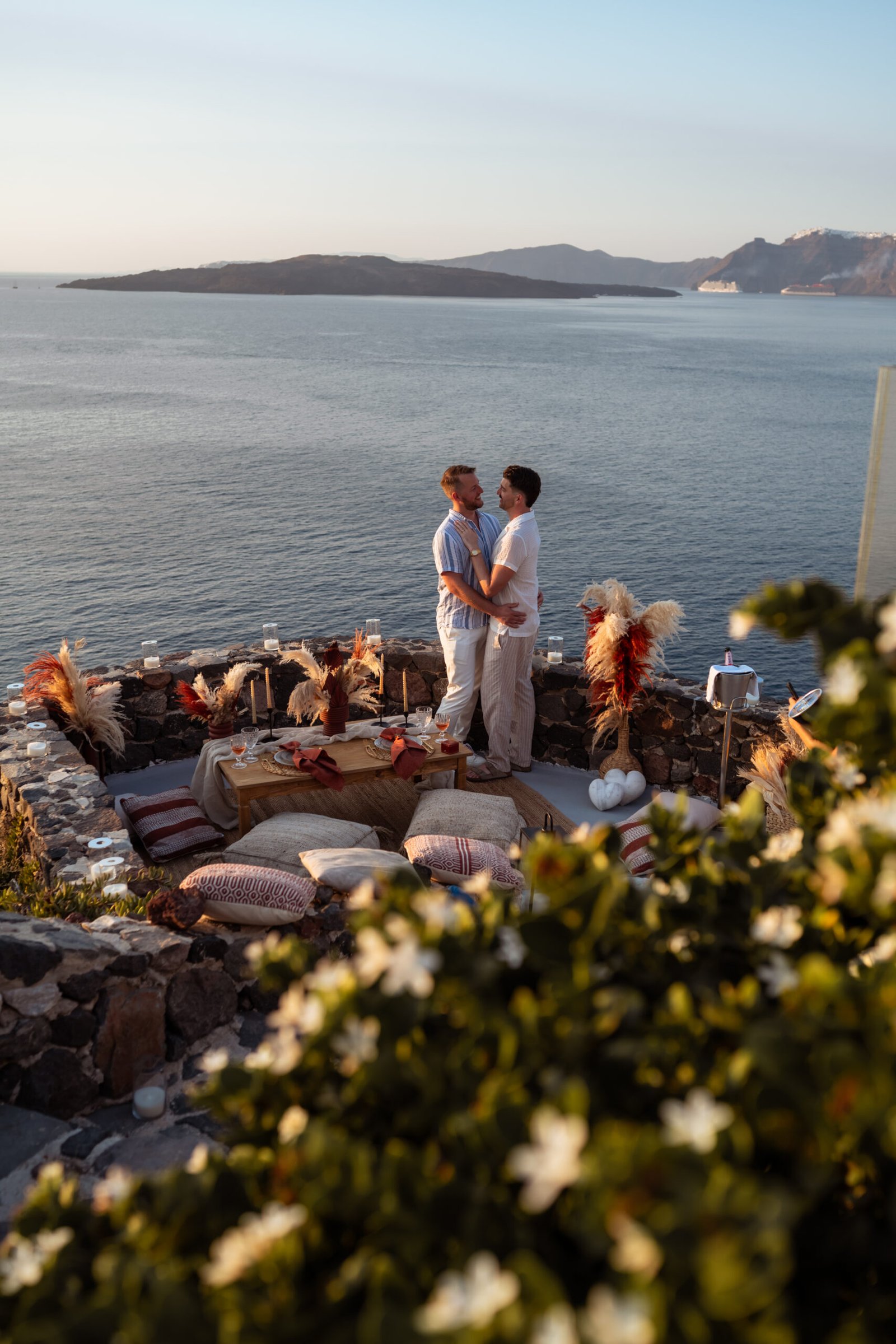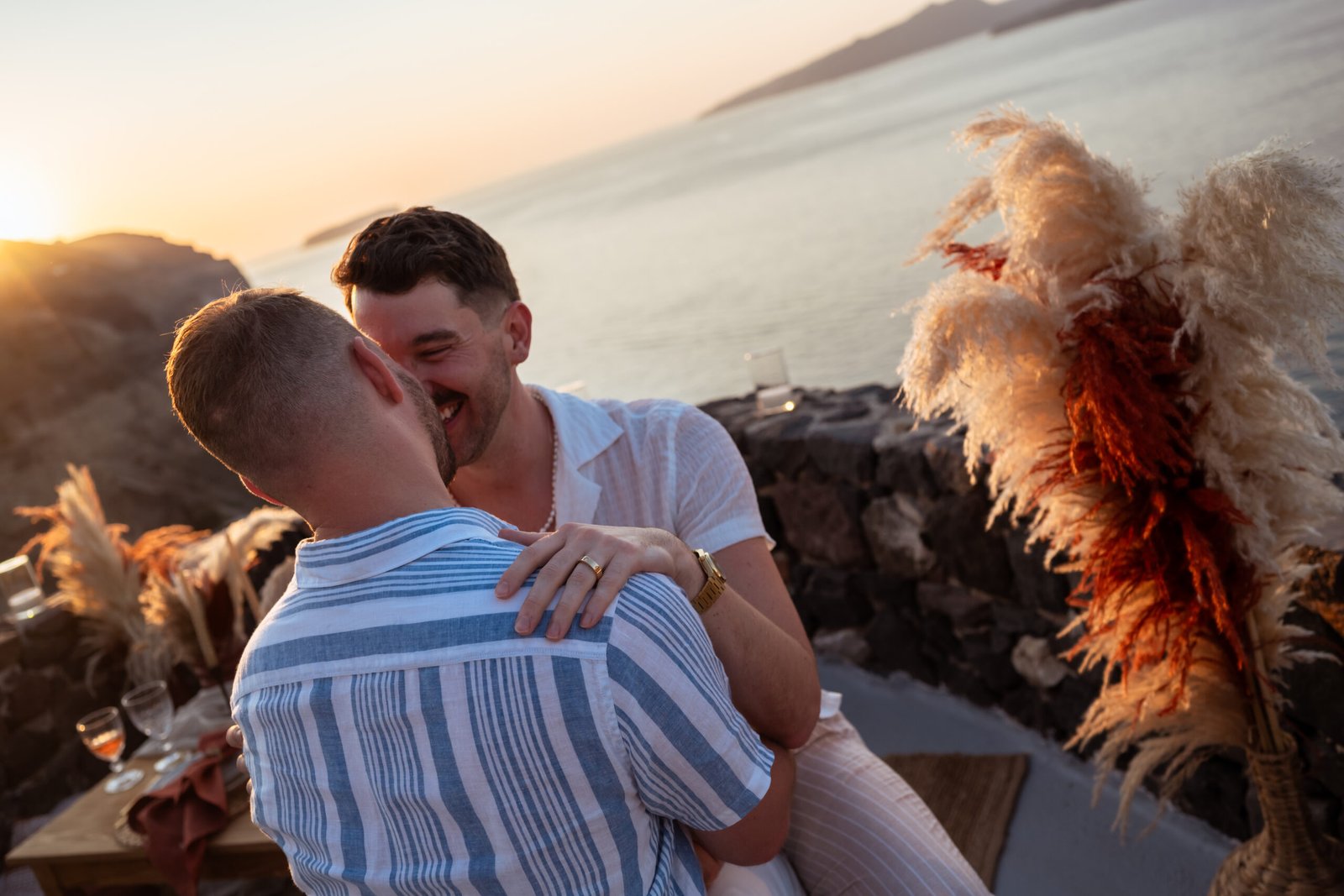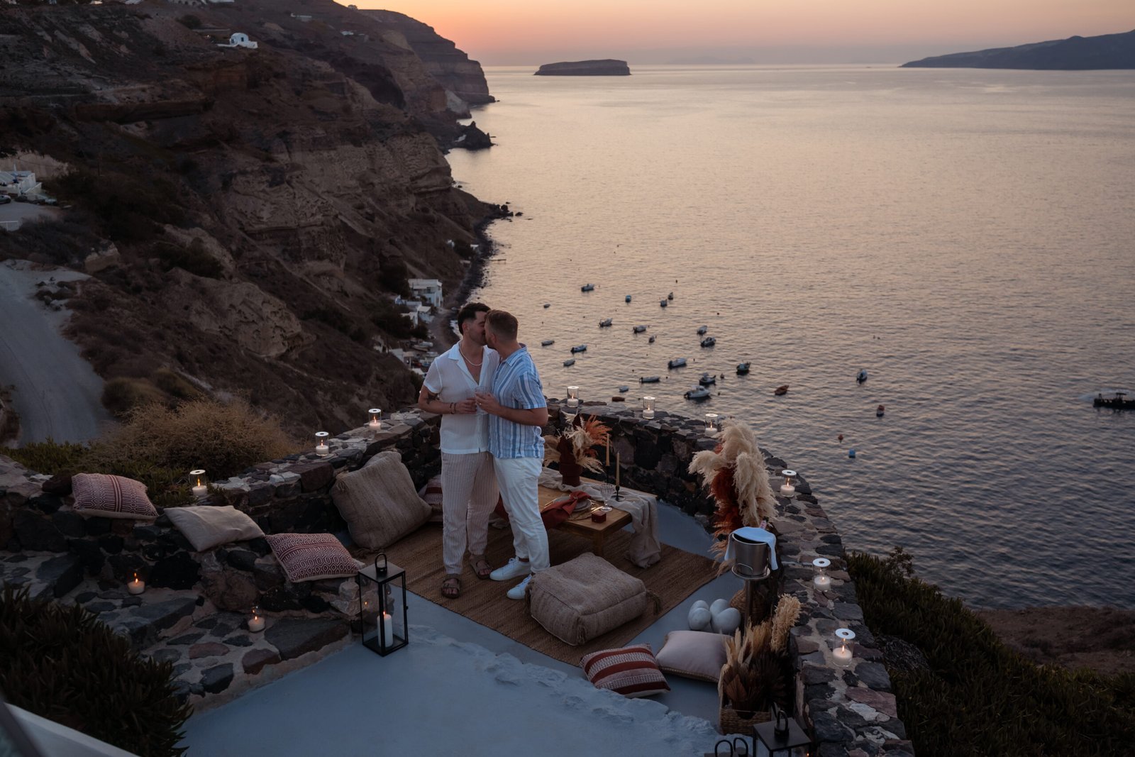 James guided Matt to the beautifully styled picnic setup, where the breathtaking Santorini sunset framed the scene. Surrounded by the endless sea and the iconic volcano view, James got down on one knee and asked the most important question of his life.