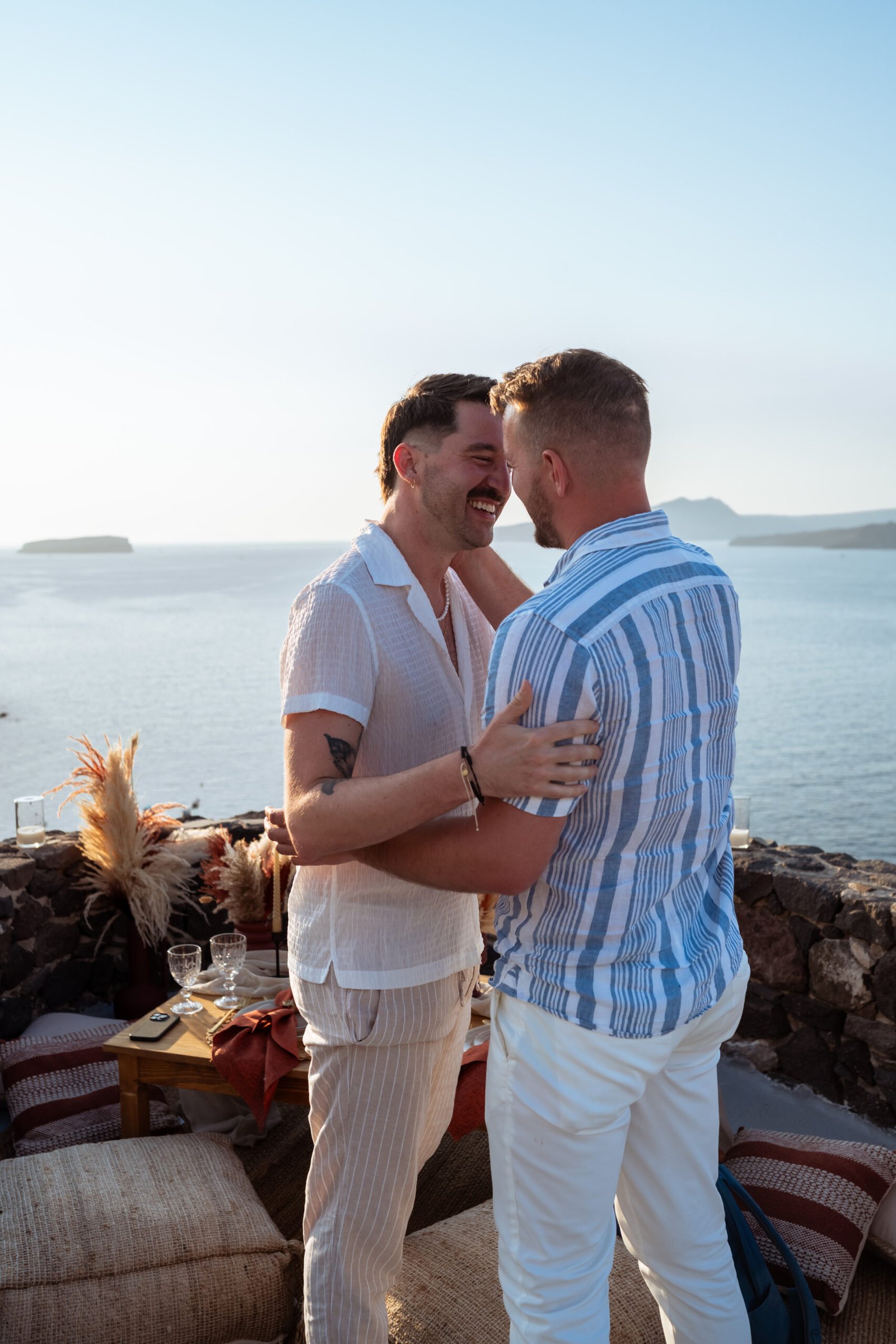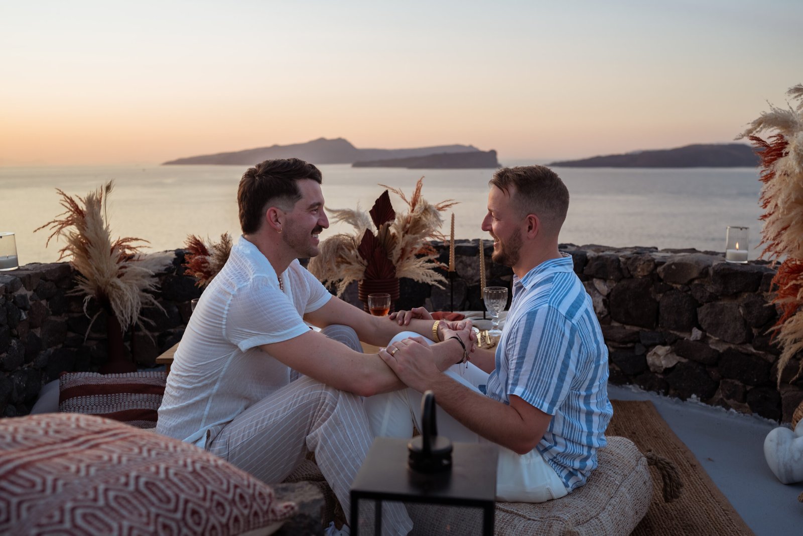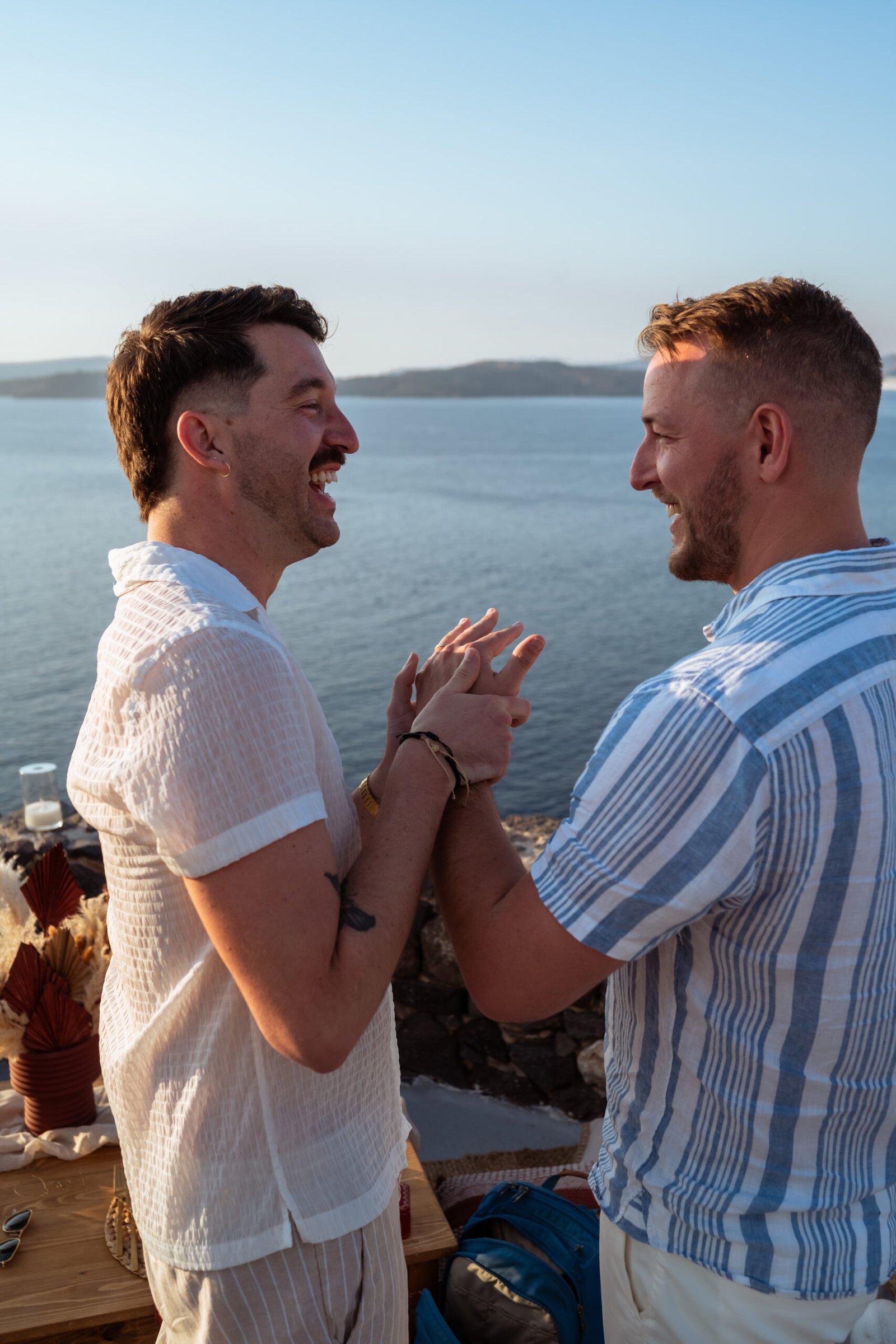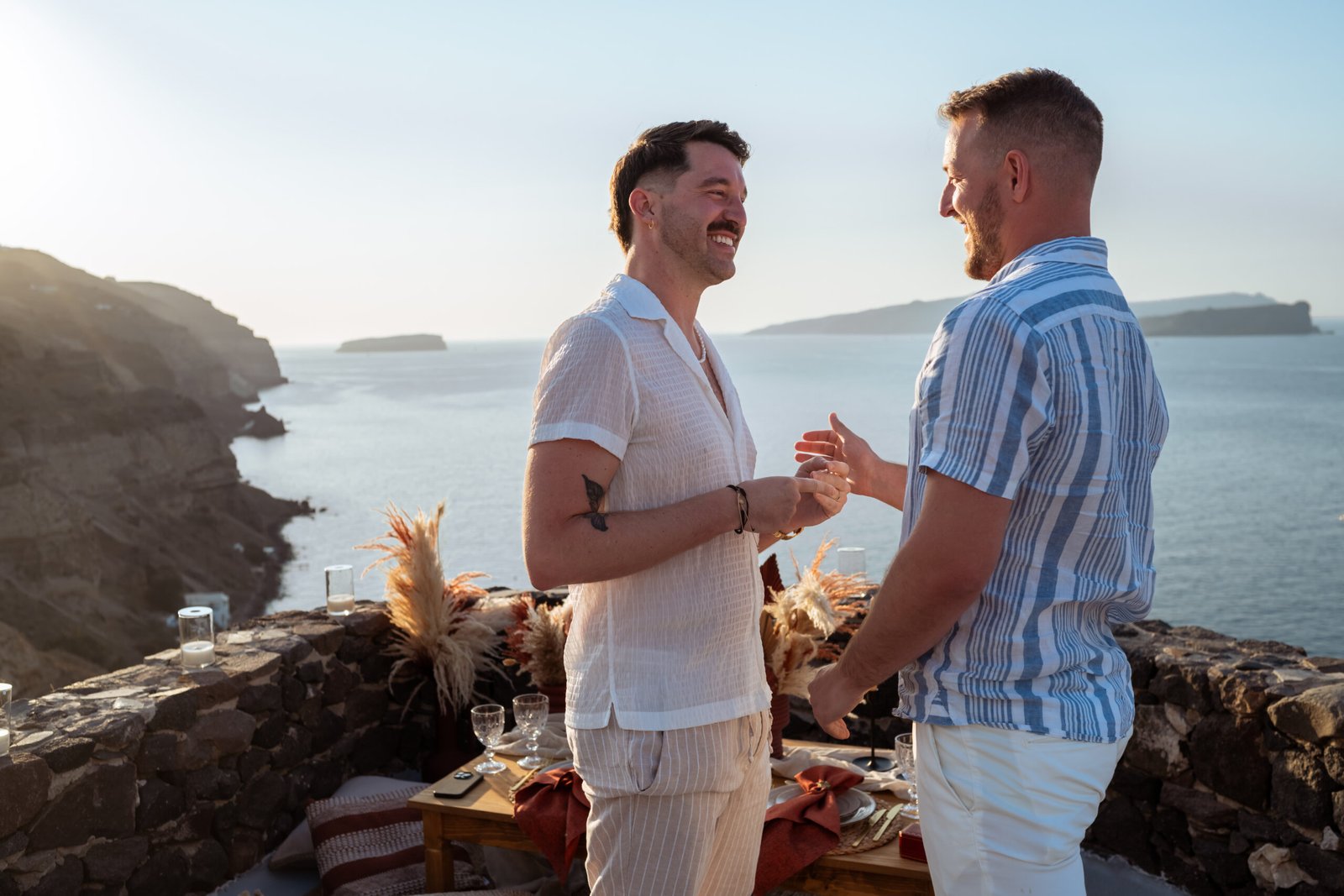 James guided Matt to the beautifully styled picnic setup, where the breathtaking Santorini sunset framed the scene. Surrounded by the endless sea and the iconic volcano view, James got down on one knee and asked the most important question of his life.