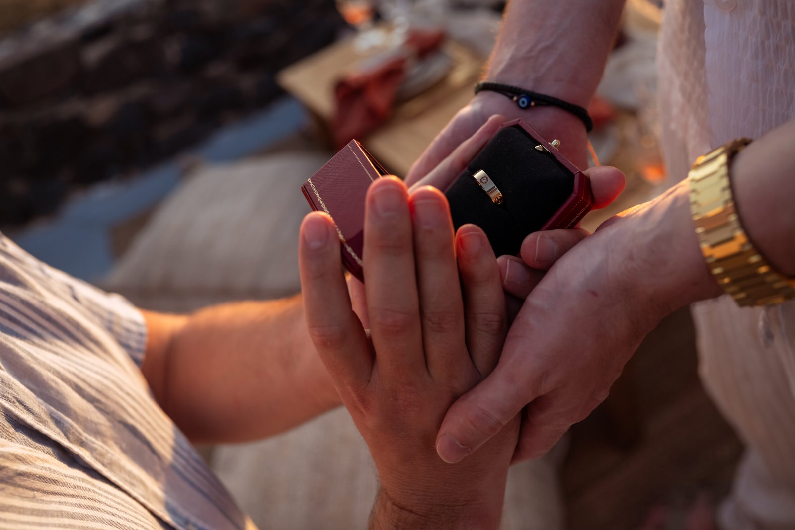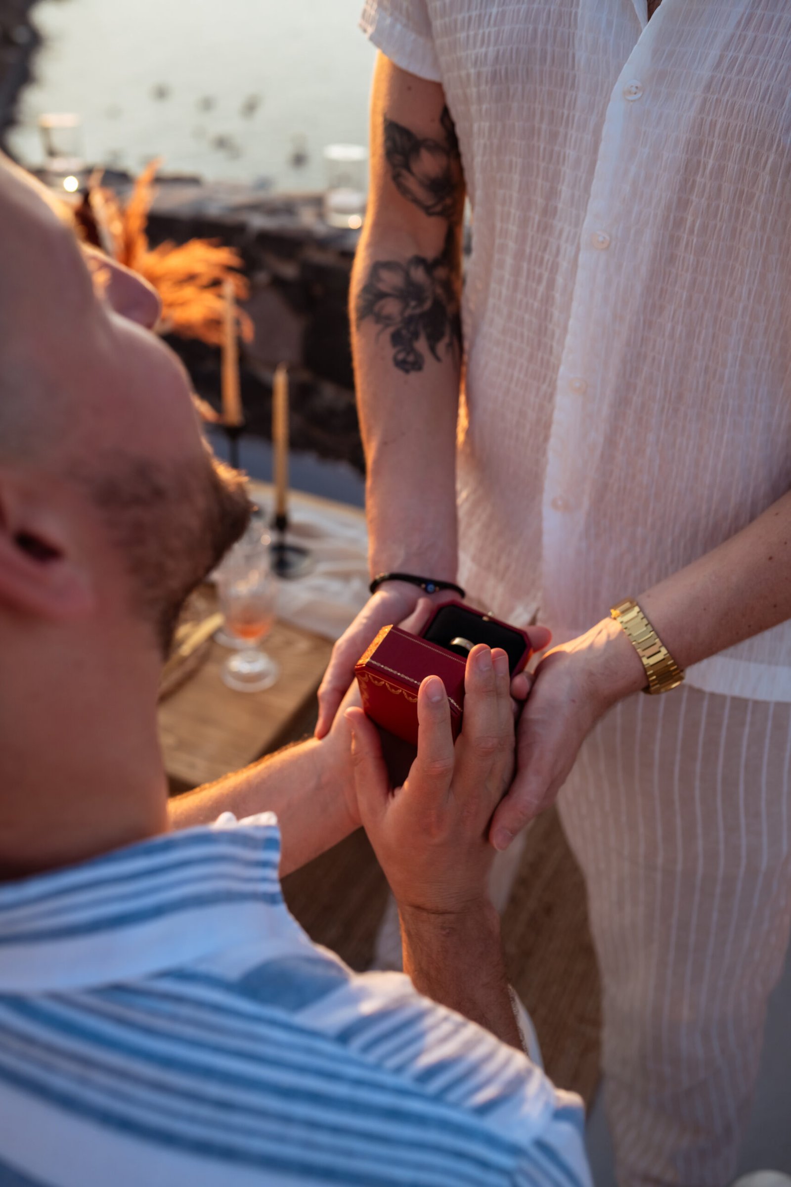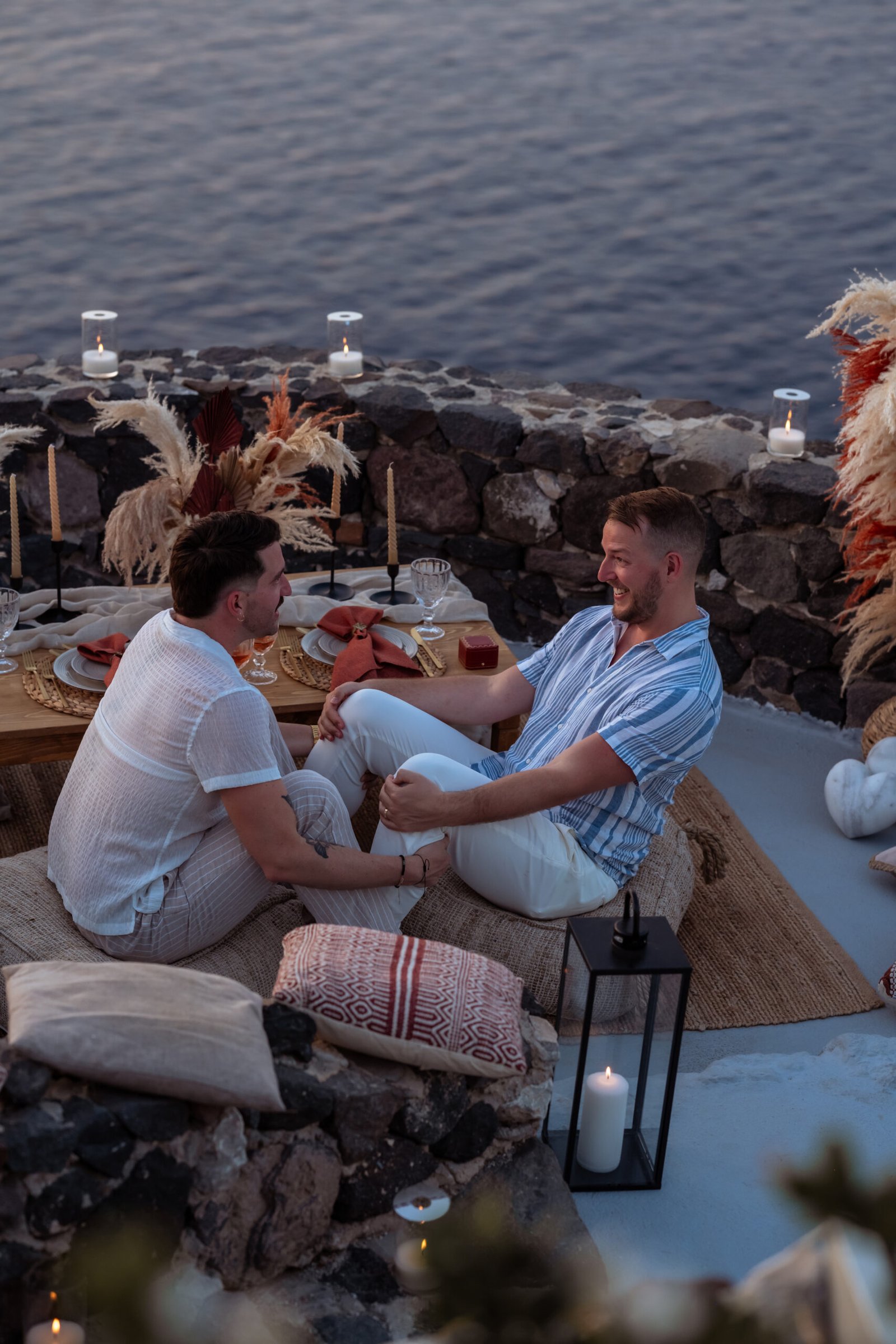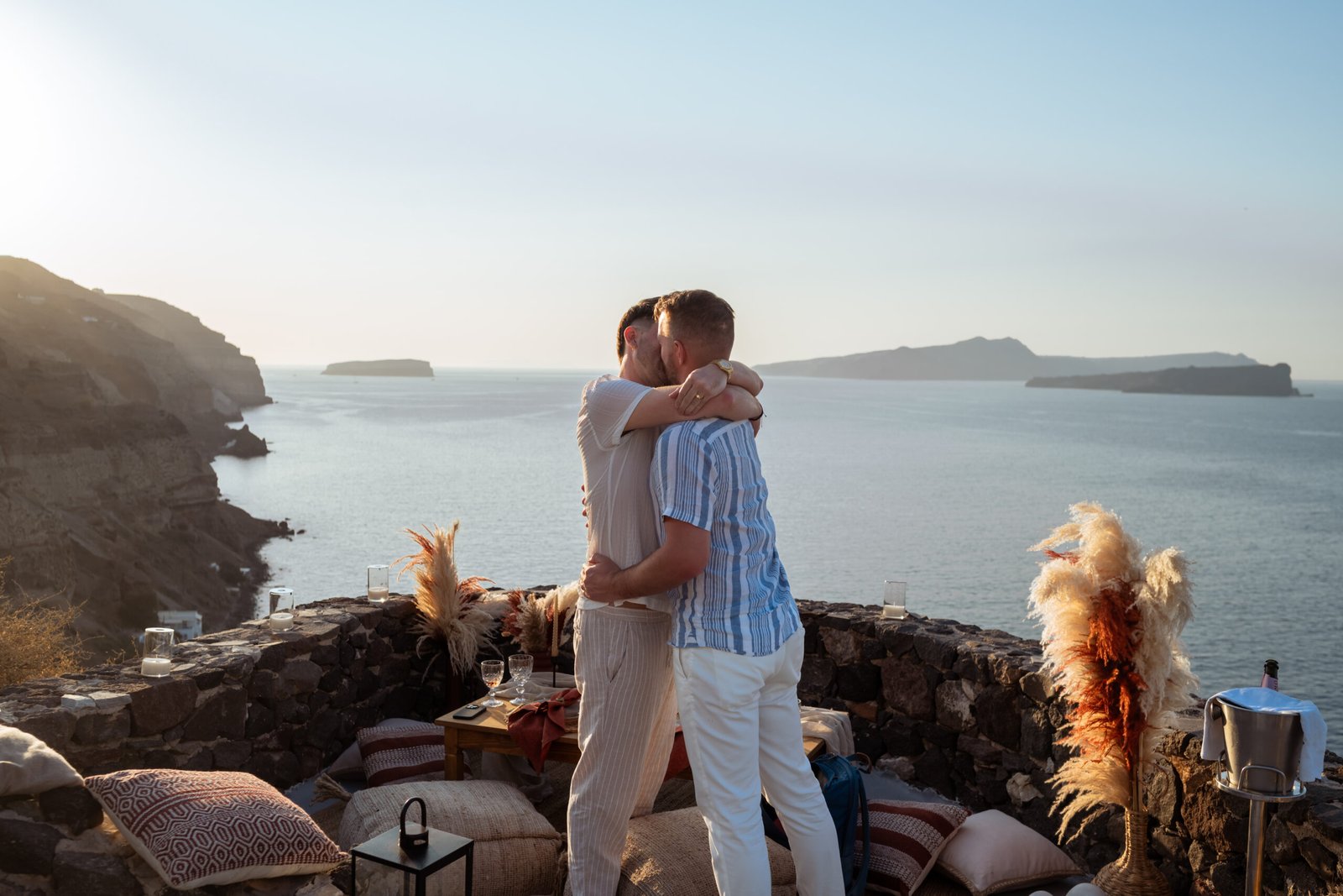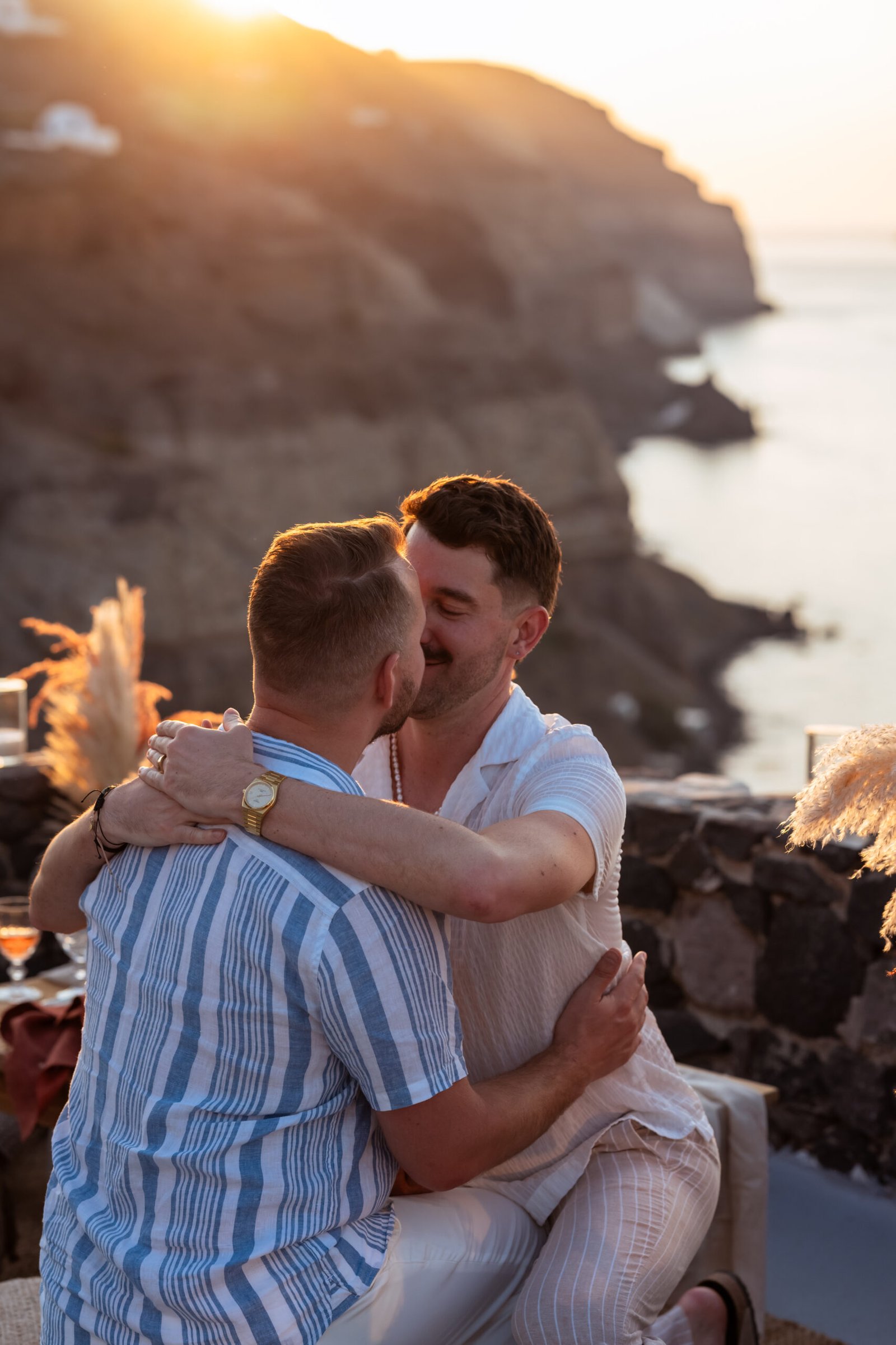 James guided Matt to the beautifully styled picnic setup, where the breathtaking Santorini sunset framed the scene. Surrounded by the endless sea and the iconic volcano view, James got down on one knee and asked the most important question of his life.