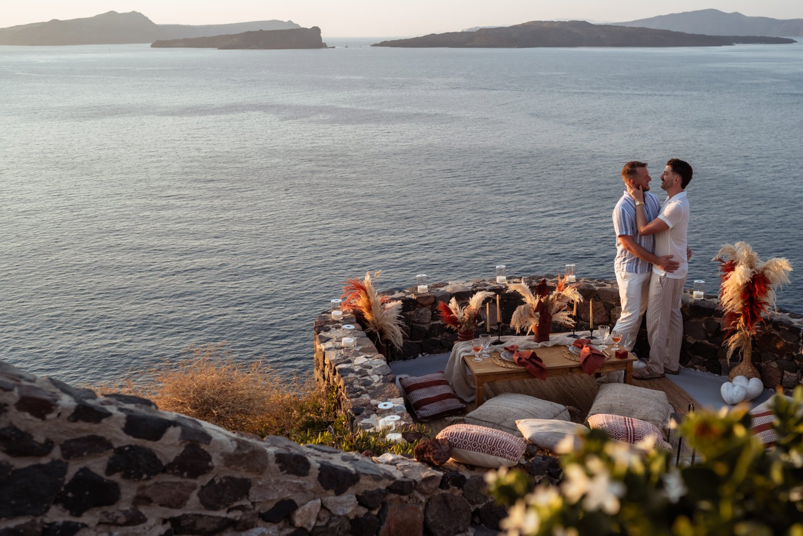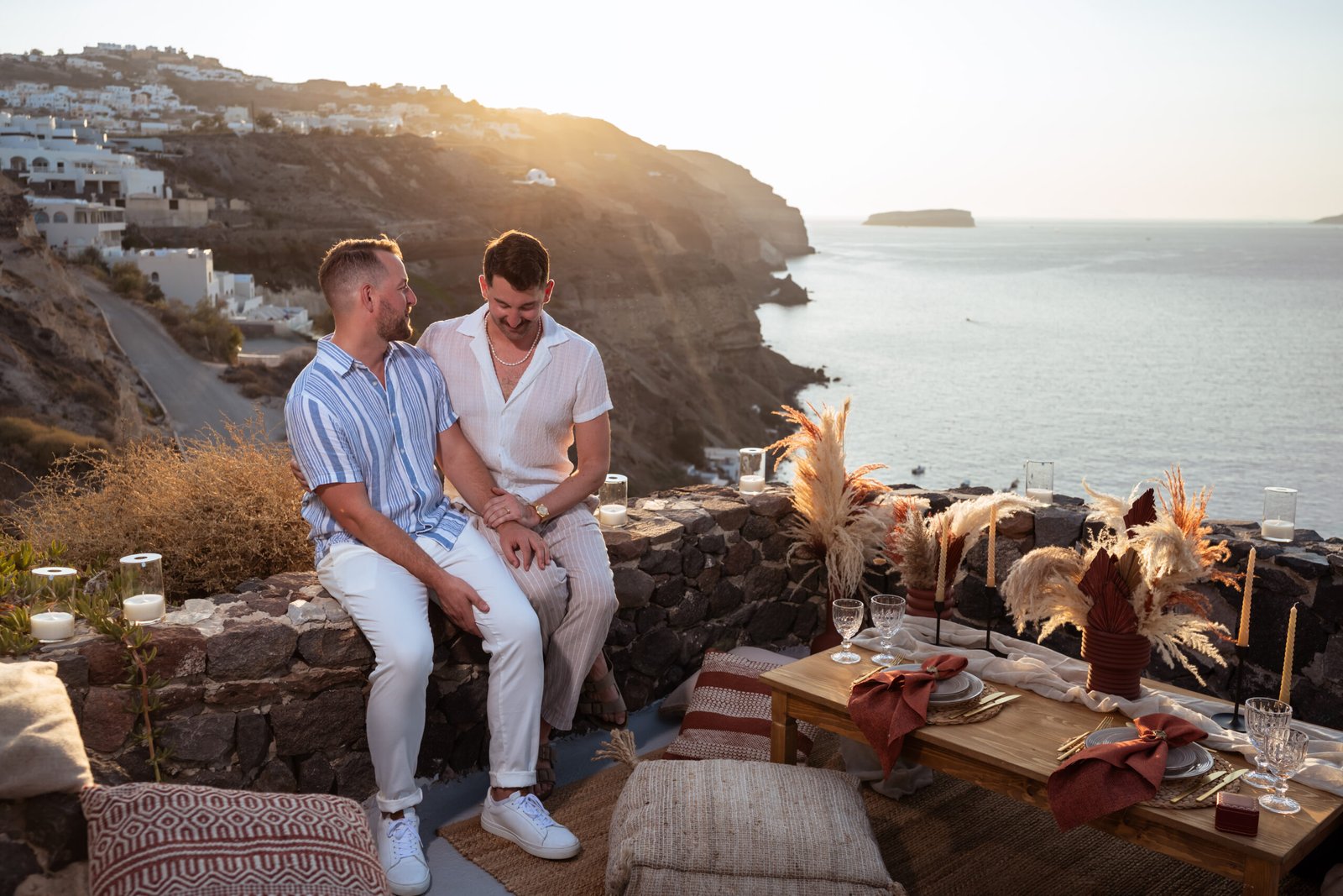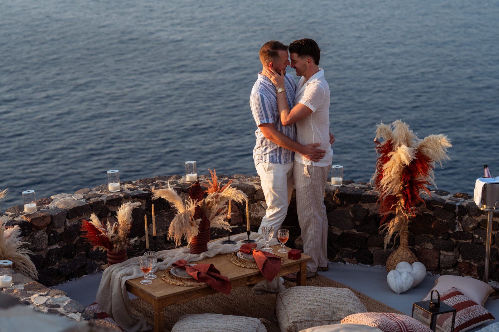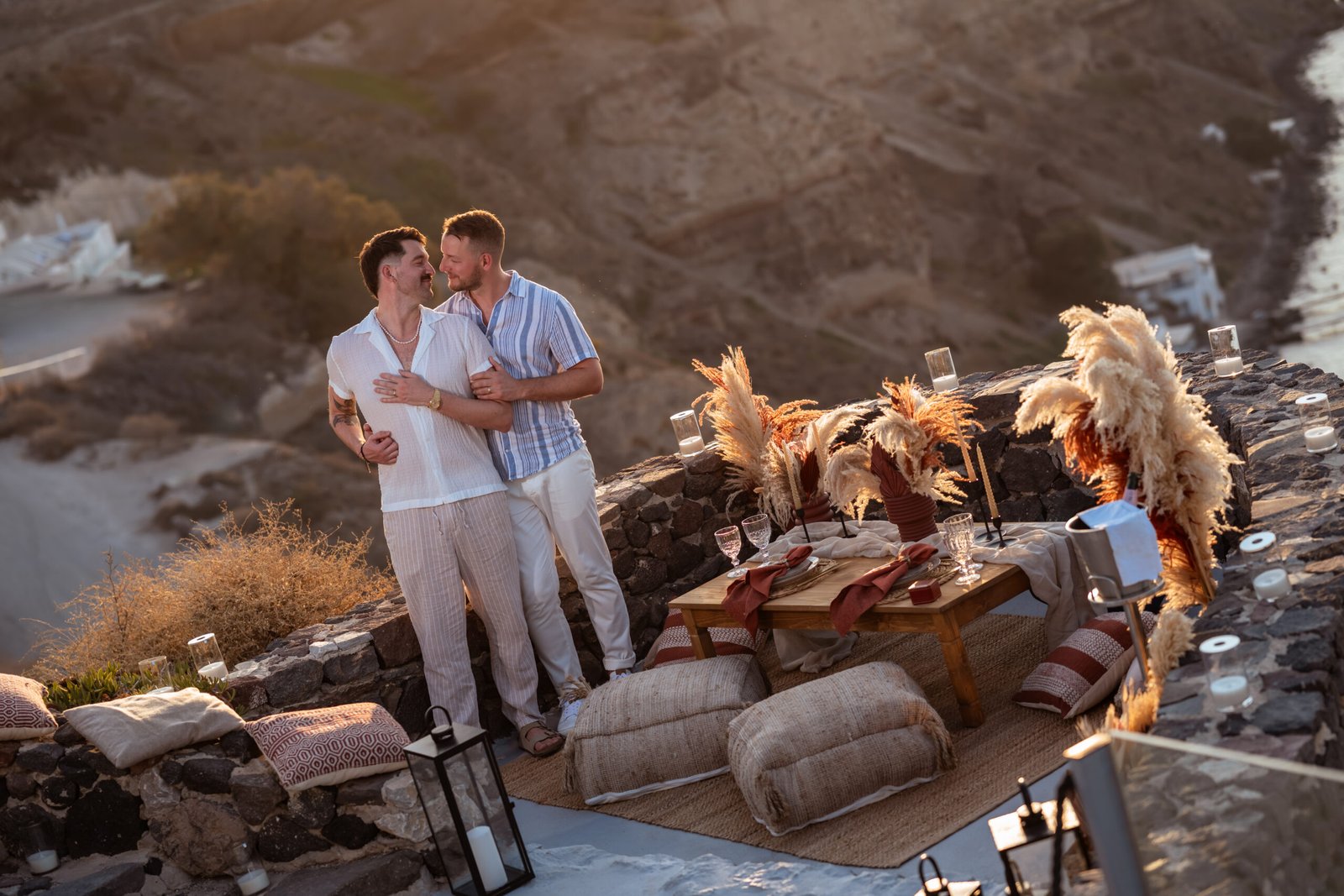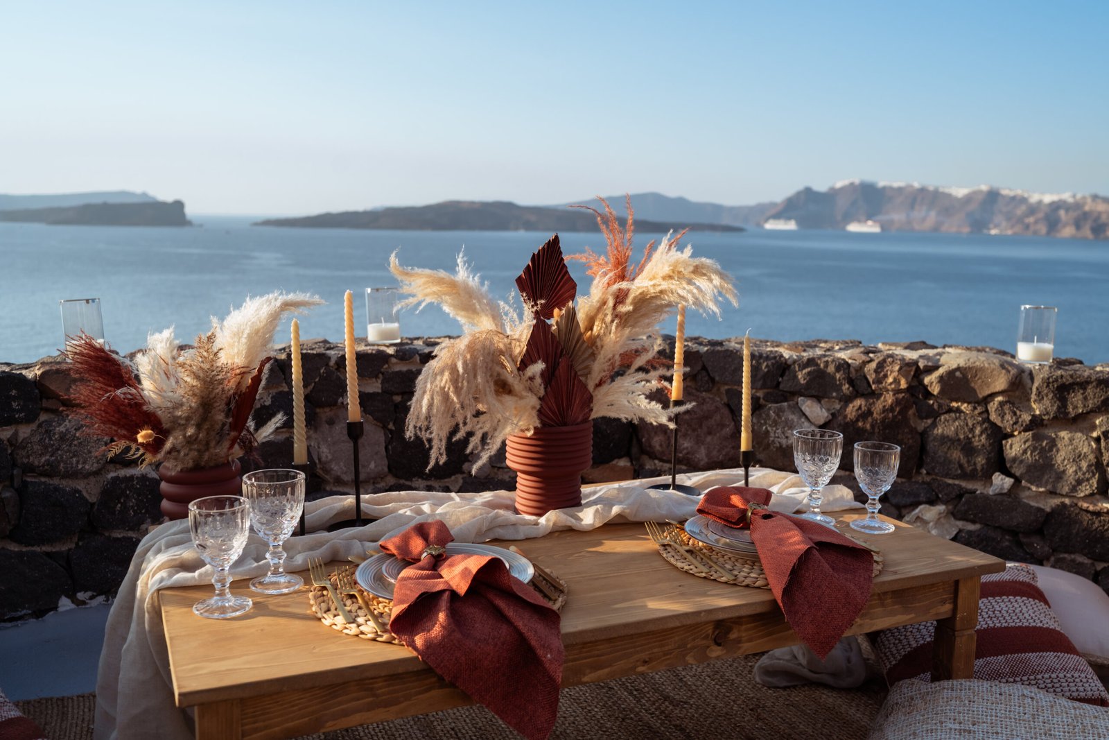 For the proposal setting, we created a romantic boho-style picnic setup overlooking the dramatic cliffs of Santorini. The design featured natural textures, pampas grass arrangements, elegant candles, and soft earthy tones that perfectly complemented the volcanic landscape and the deep blue of the Aegean Sea.