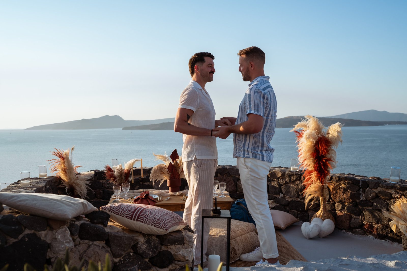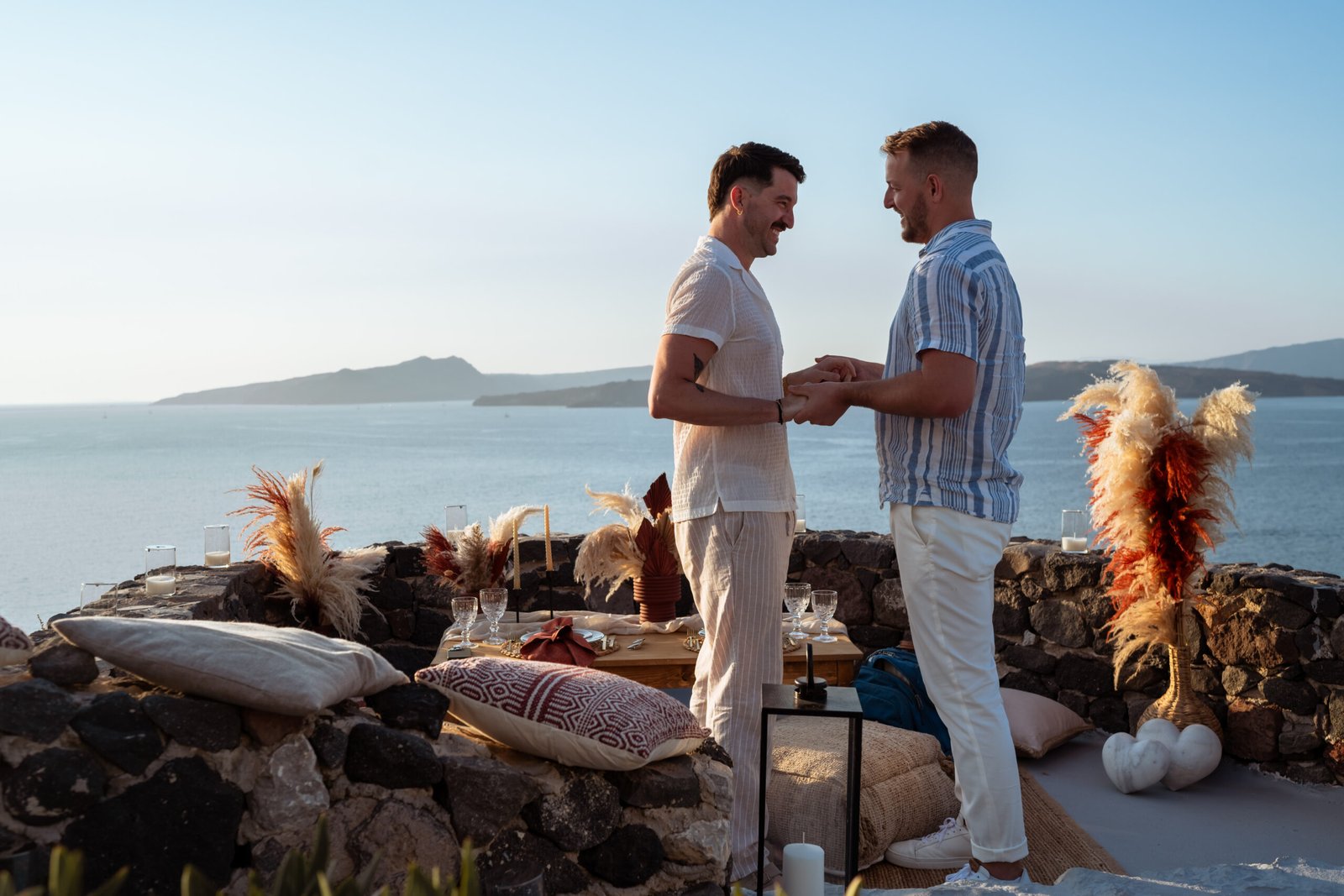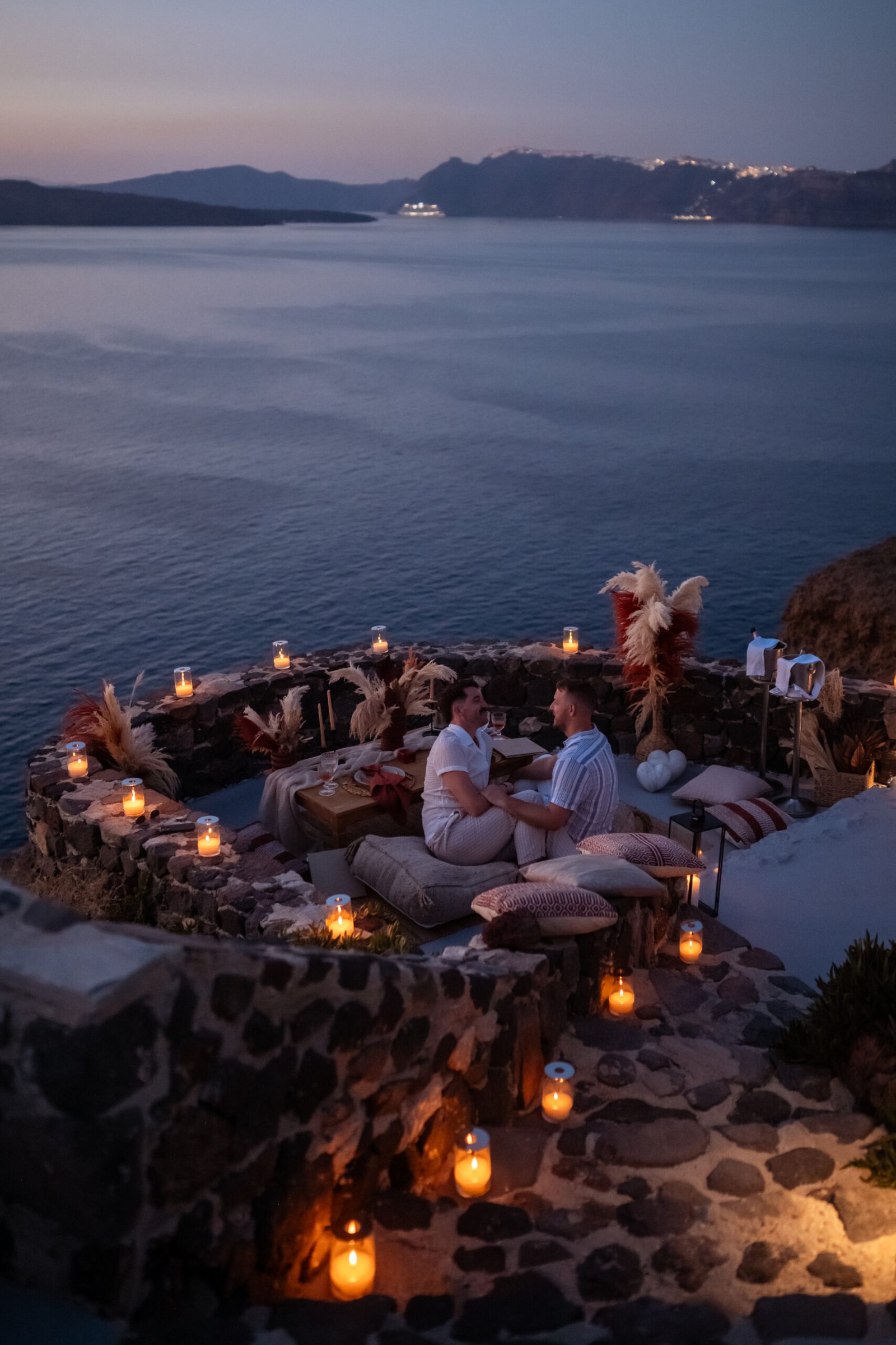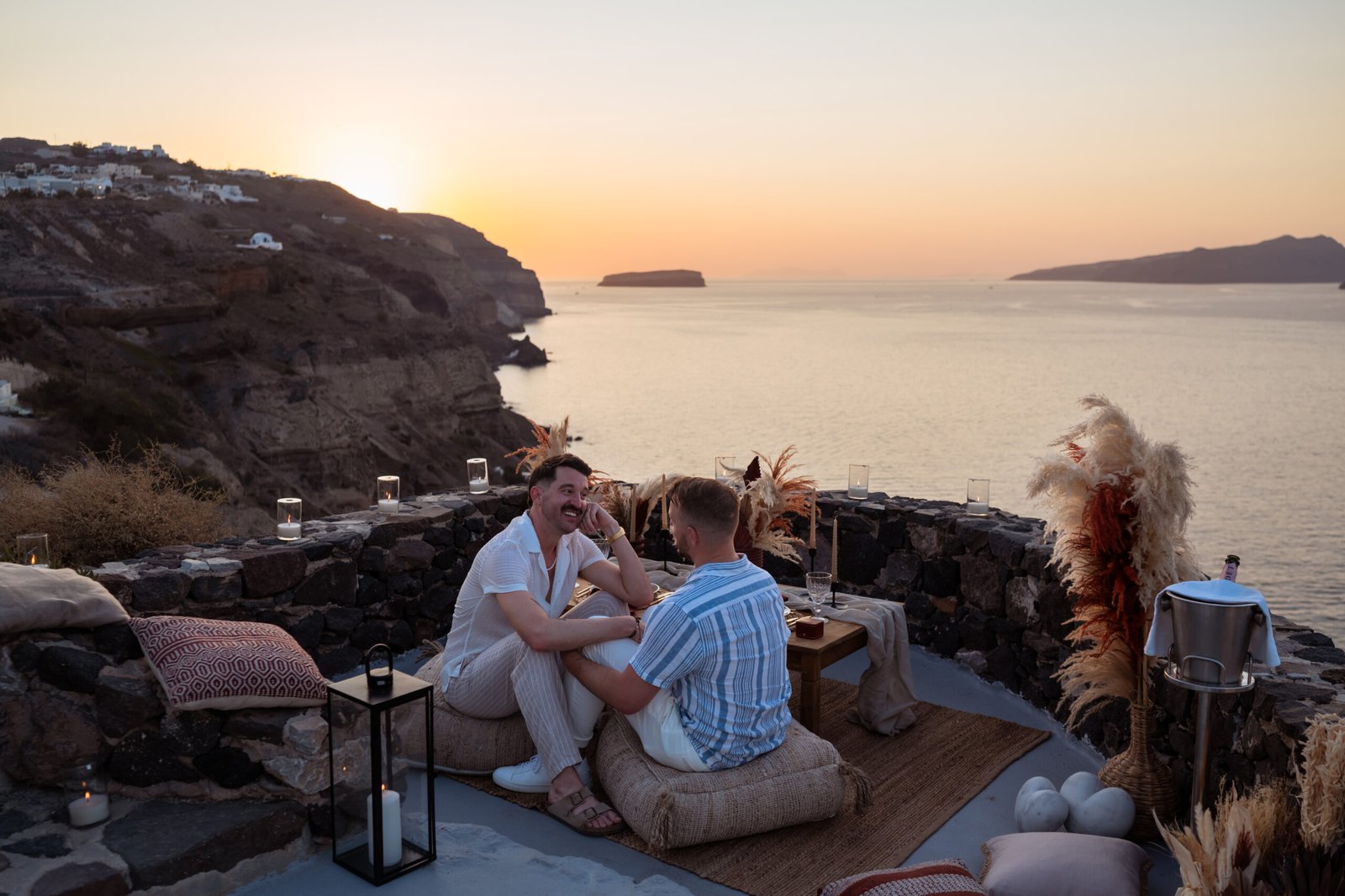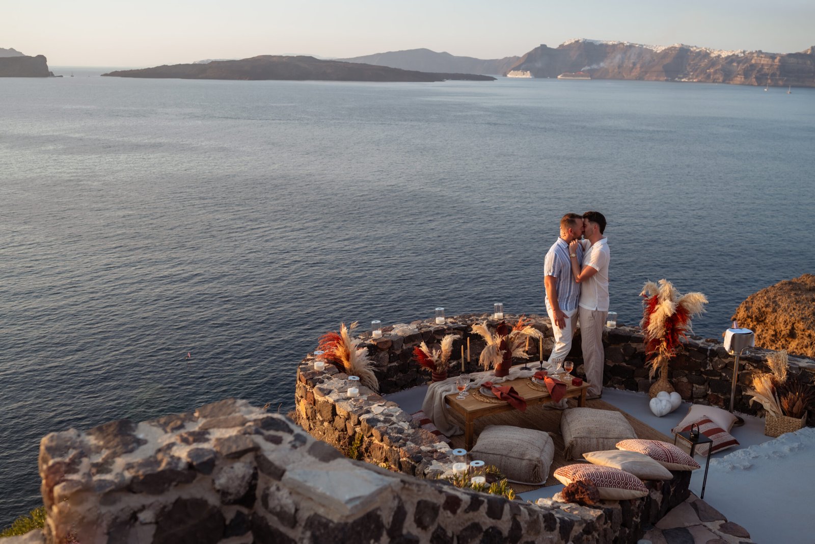 For the proposal setting, we created a romantic boho-style picnic setup overlooking the dramatic cliffs of Santorini. The design featured natural textures, pampas grass arrangements, elegant candles, and soft earthy tones that perfectly complemented the volcanic landscape and the deep blue of the Aegean Sea.