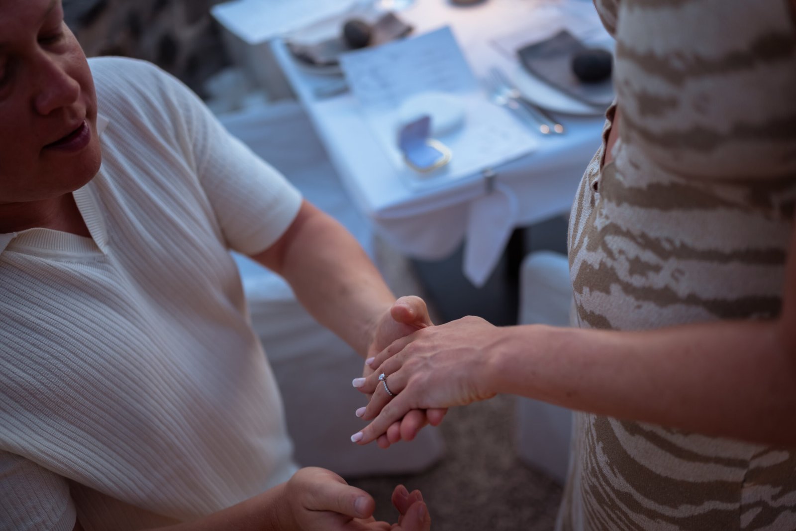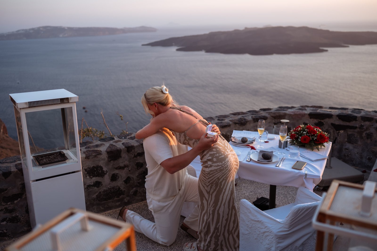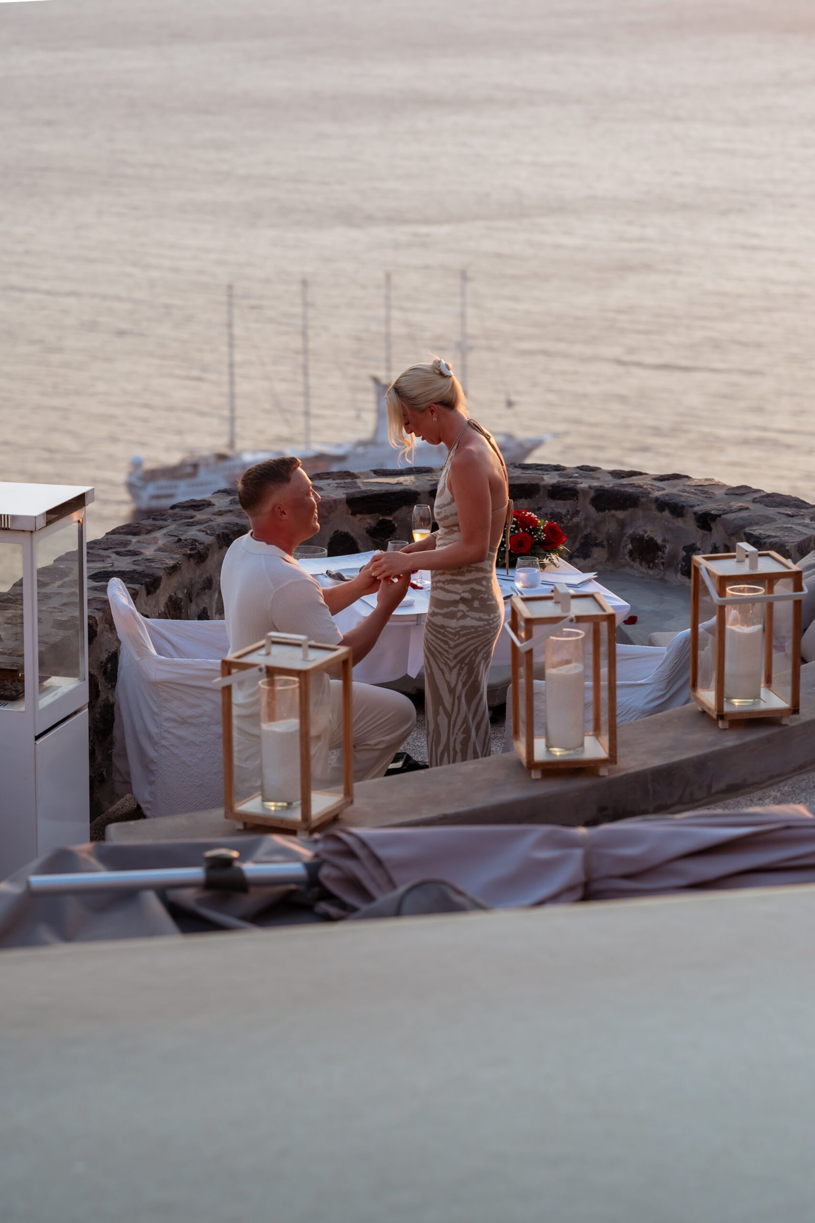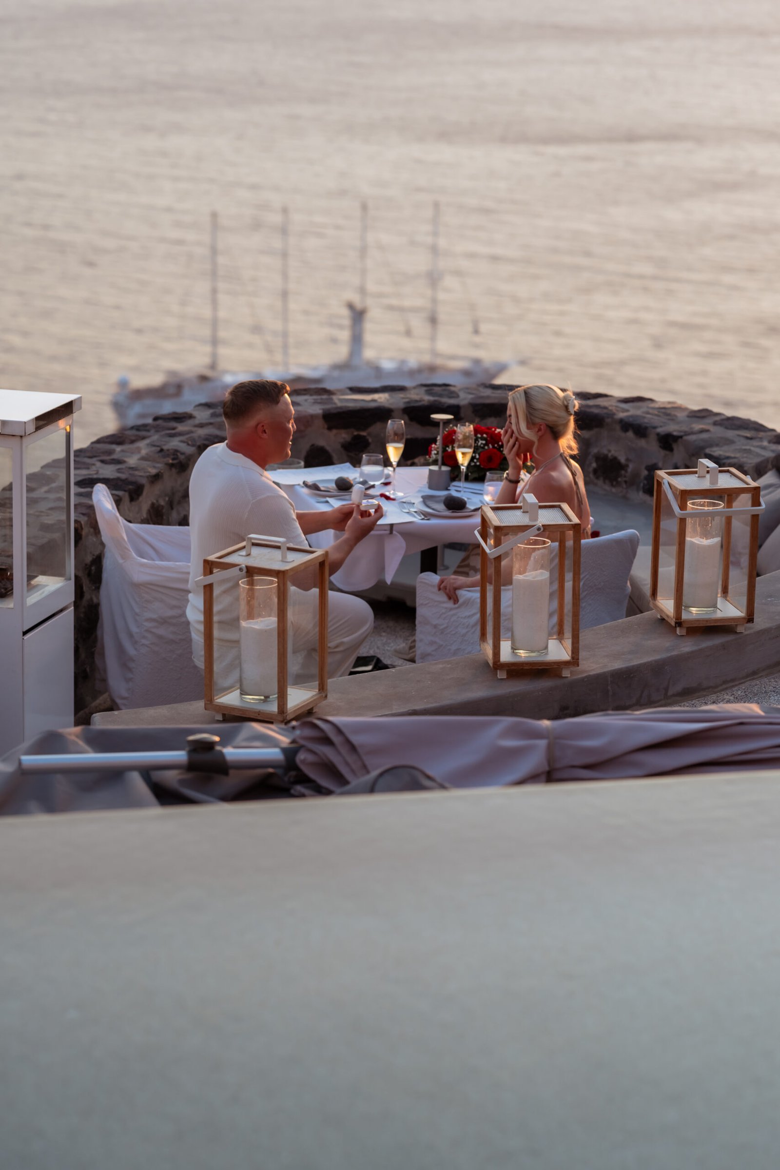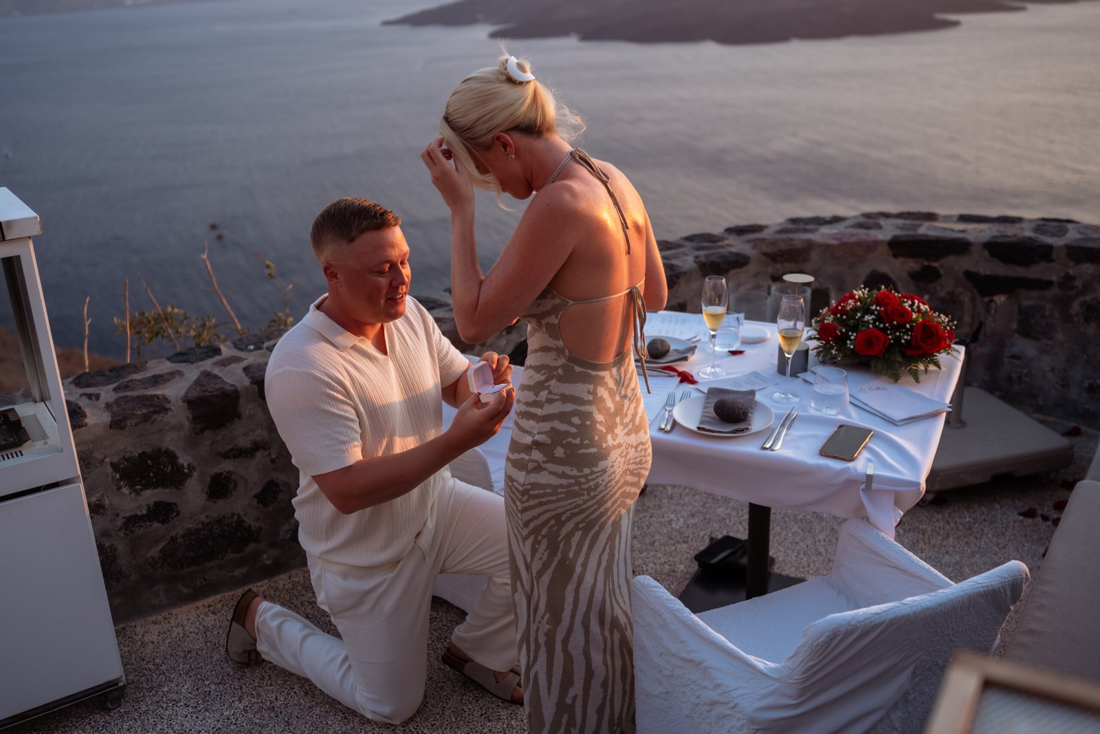 As the golden light of sunset began to fall over the caldera, the terrace overlooking the breathtaking cliffs of Santorini Caldera was quietly set for a romantic surprise. Our team blended naturally into the restaurant environment, appearing like regular guests so Chloe wouldn’t suspect that something extraordinary was about to happen.
