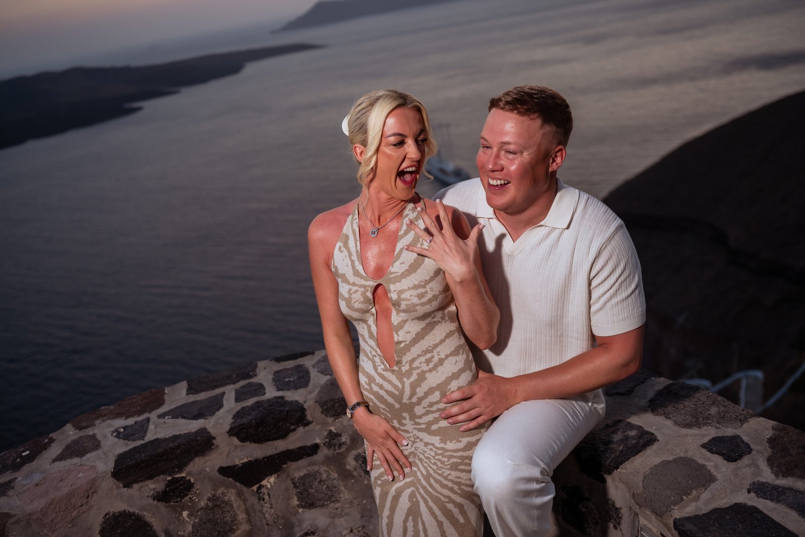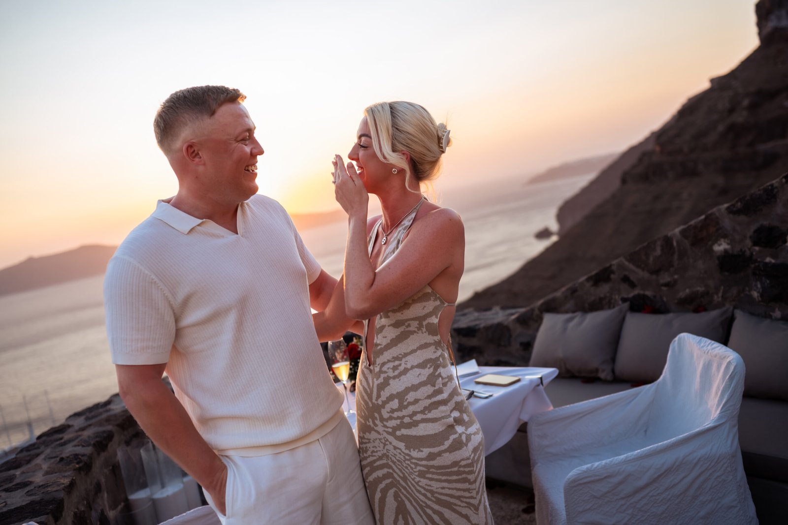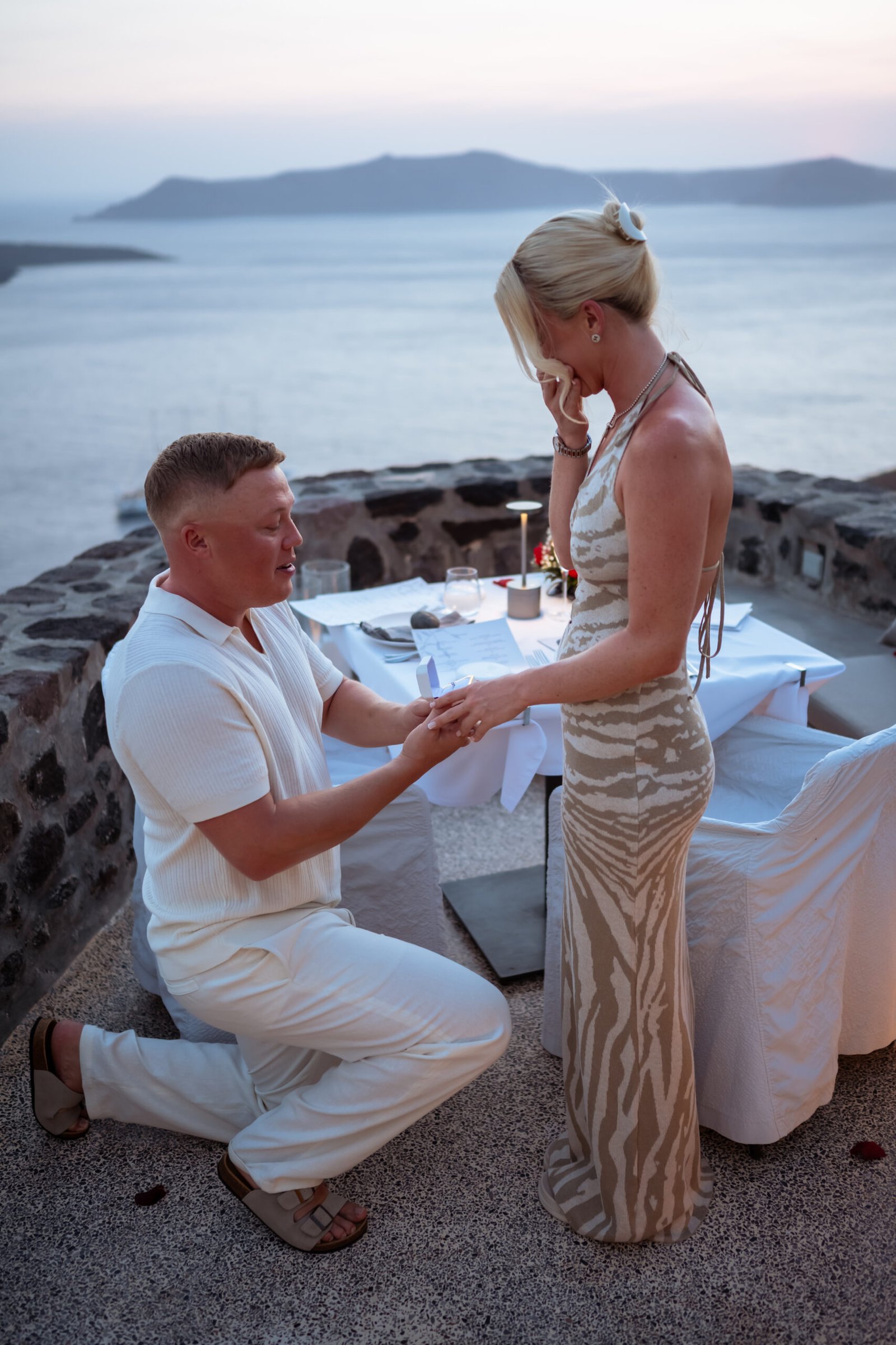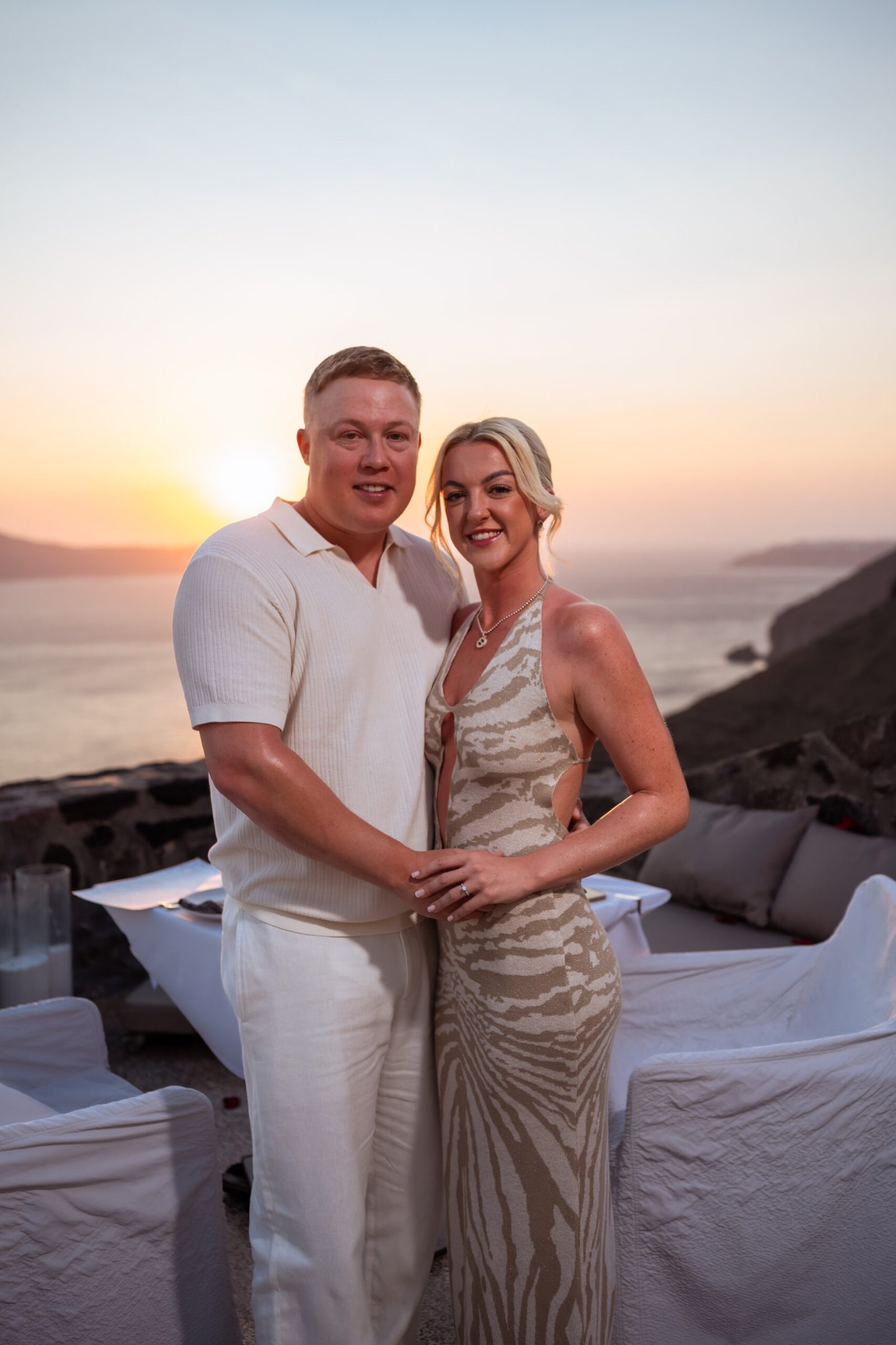 During a romantic sunset dinner overlooking the Aegean Sea, with the volcano of Nea Kameni rising in the distance, Warren chose the perfect moment to propose to Chloe. As the sky turned warm shades of gold and pink, he asked the question that took her completely by surprise. Her reaction was filled with pure emotion — joy, tears, and laughter — while every moment was beautifully captured through photography and cinematic video. As night fell and the lights of Fira began to glow along the cliffs, the unforgettable Santorini proposal turned into the beginning of a magical celebration.