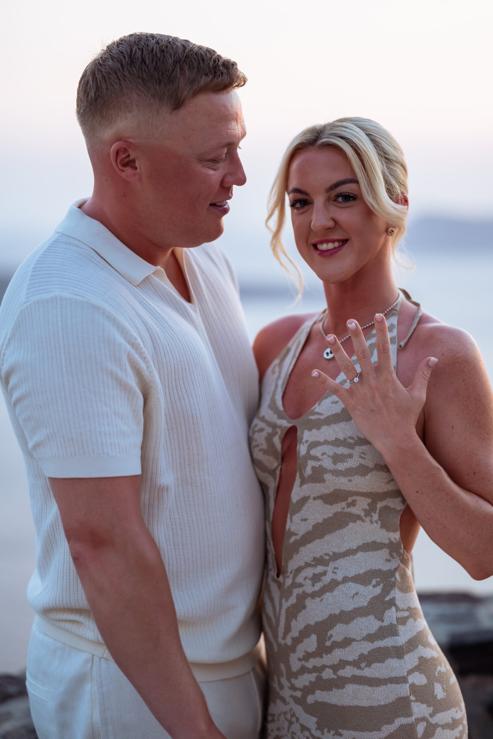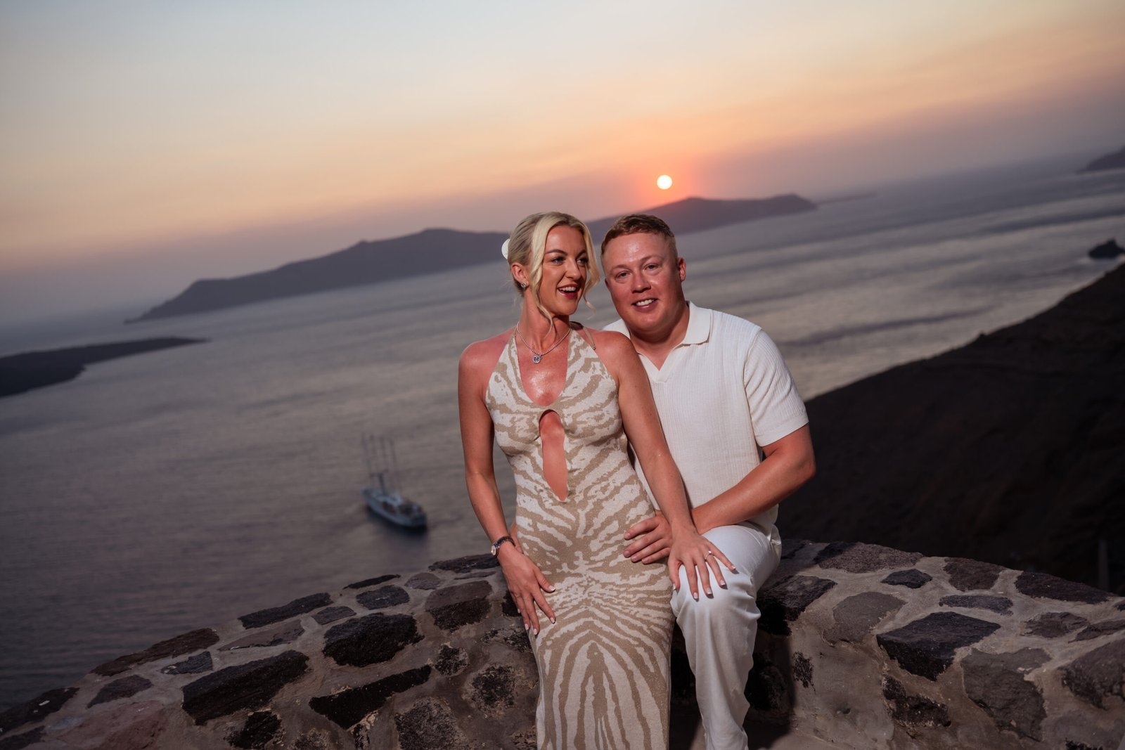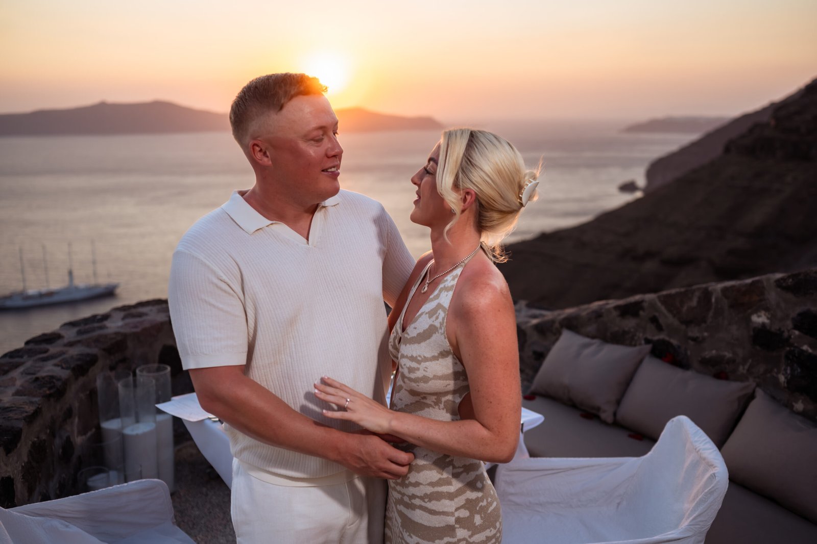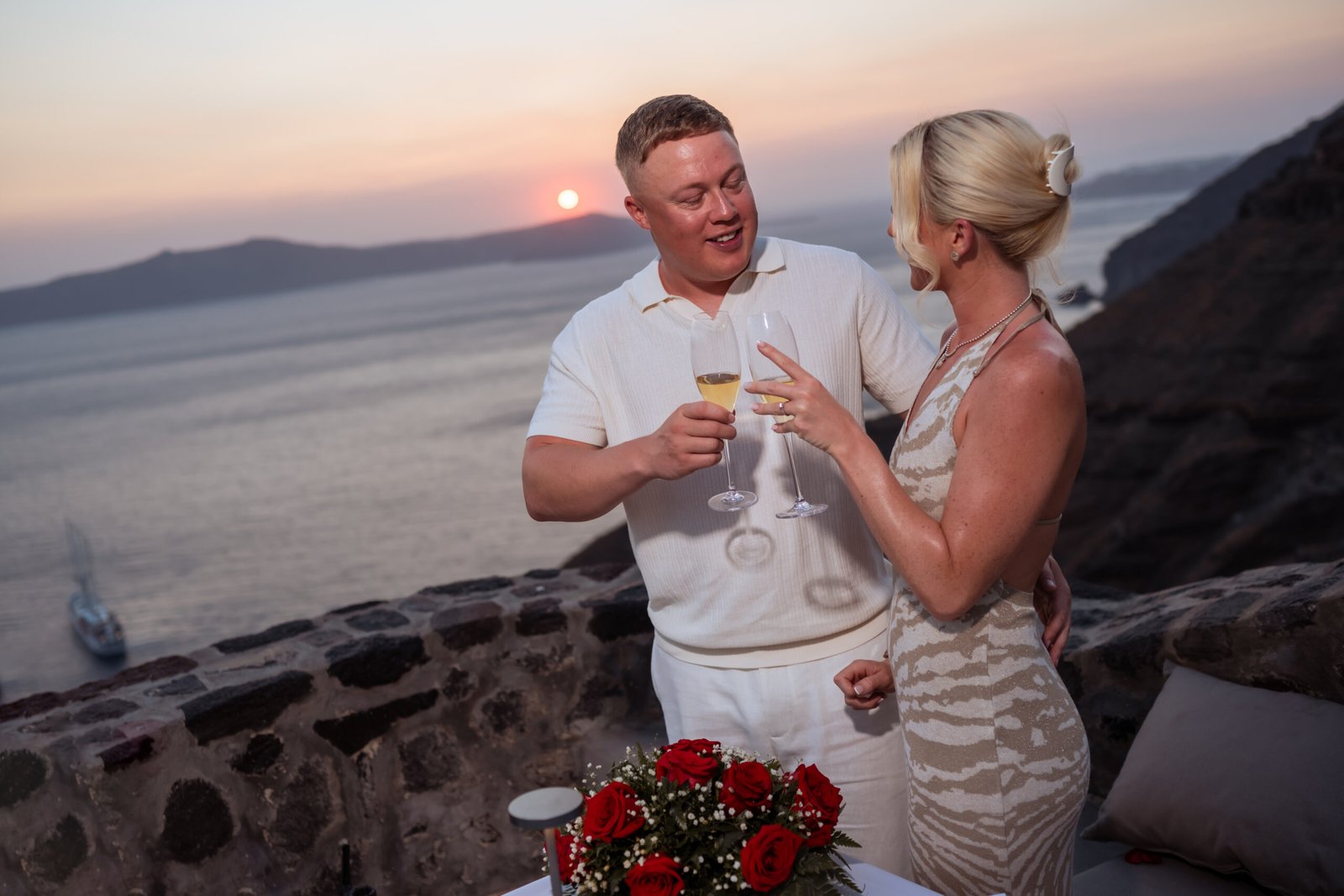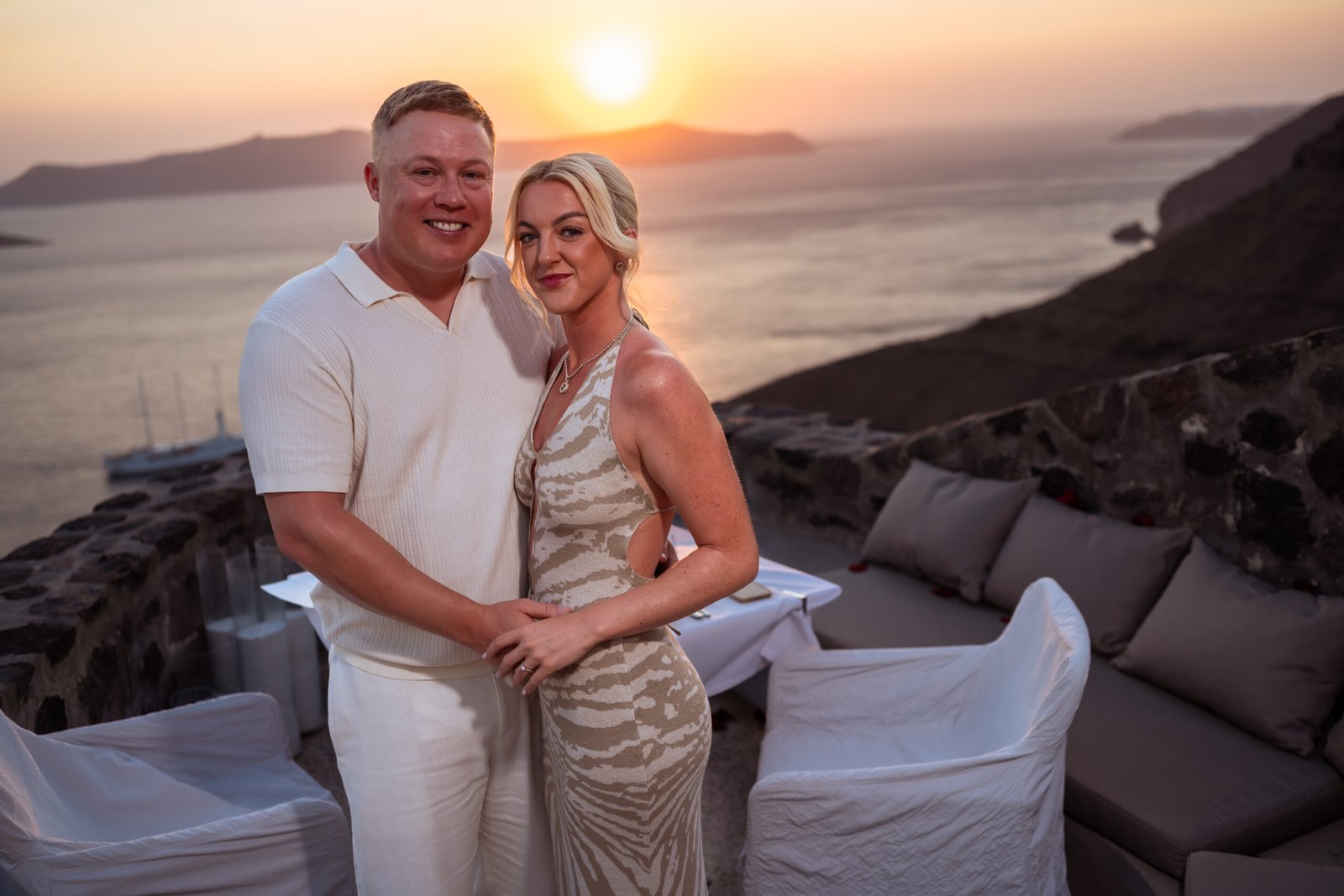 During a romantic sunset dinner overlooking the Aegean Sea, with the volcano of Nea Kameni rising in the distance, Warren chose the perfect moment to propose to Chloe. As the sky turned warm shades of gold and pink, he asked the question that took her completely by surprise. Her reaction was filled with pure emotion — joy, tears, and laughter — while every moment was beautifully captured through photography and cinematic video. As night fell and the lights of Fira began to glow along the cliffs, the unforgettable Santorini proposal turned into the beginning of a magical celebration.