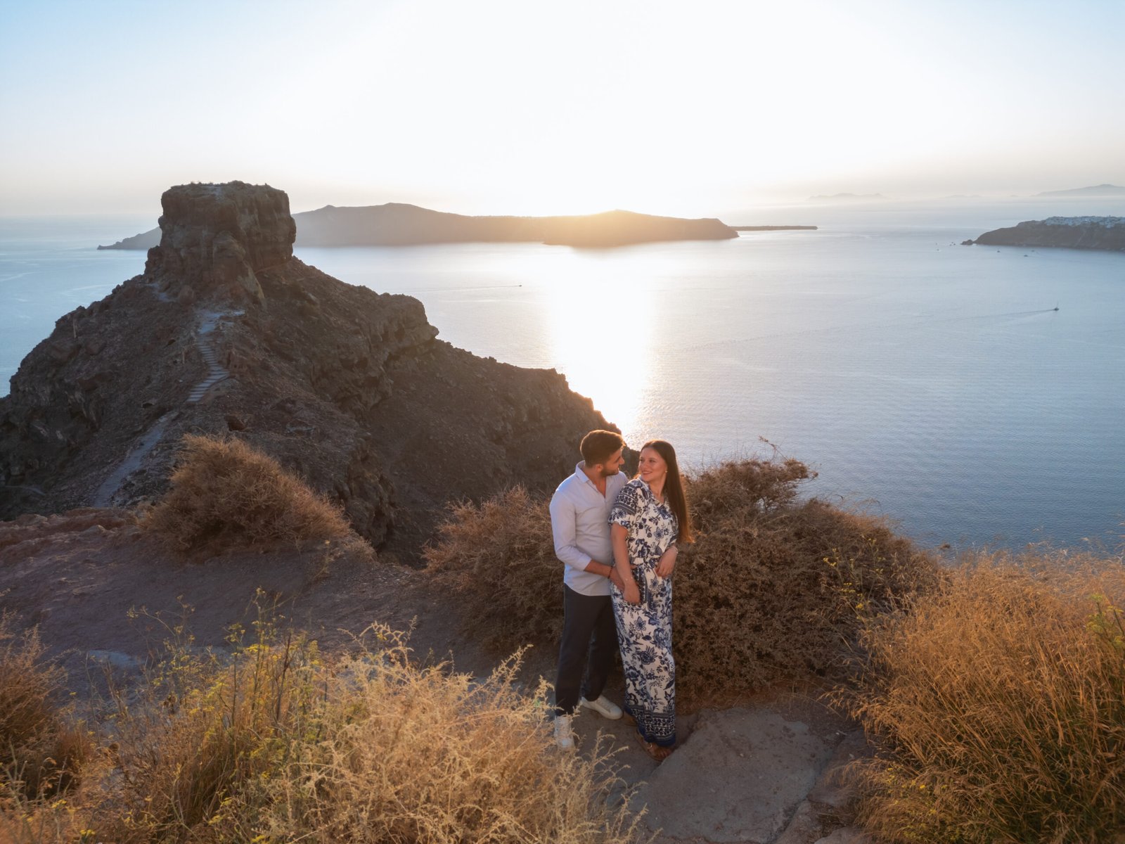 dramatic view of the caldera and Nea Kameni volcano in the background, he got down on